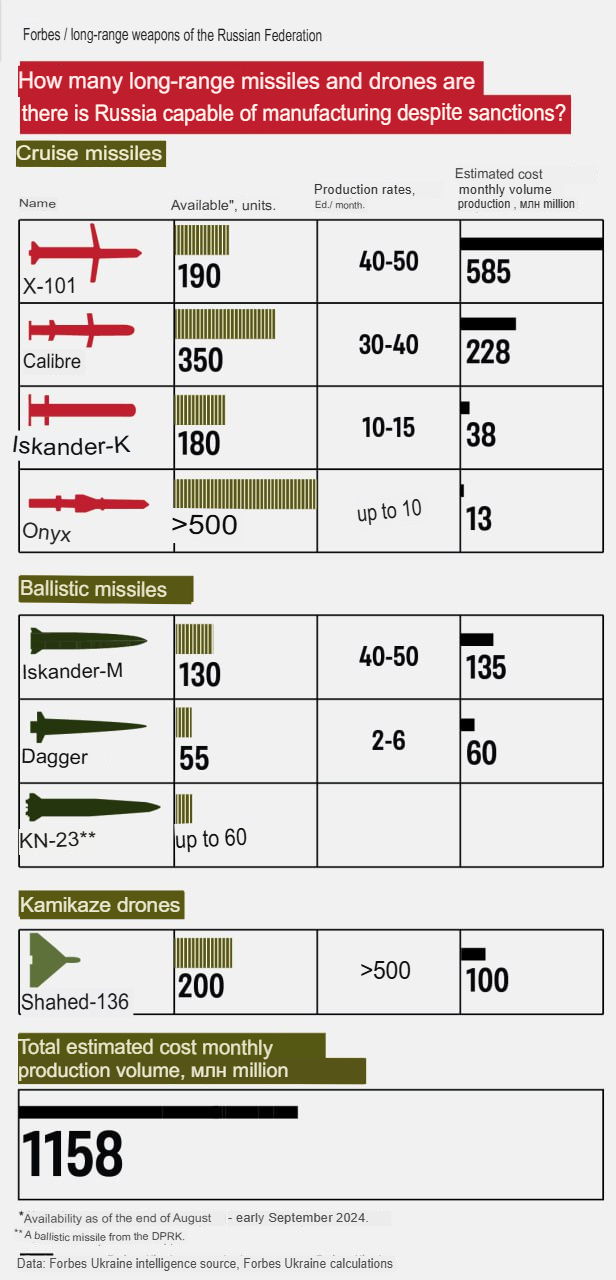 Celkově Forbes uvádí, že každý měsíc rusko utratí za rakety 1,1 miliardy dolarů (24,8 mld Kč) a 100 milionů za drony (2,3 mld Kč). Celkové výrobní tempo prý činí 132-171 raket za měsíc. Rusko vynakládá největší množství peněz, 585 mil dolarů měsíčně, na výrobu řízených střel Ch-101 a 228 mil dolarů na výrobu střel Kalibr. V průměru Rusko vyrábí 45 a 35 střel těchto typů měsíčně. Každý měsíc nové rakety Iskander-K a Oniks stojí Rusko 38 a 13 mil dolarů a jejich množství je ve srovnání s jinými řízenými střelami malé – 10–15 a až 10 kusů za měsíc. Rusko vynakládá 135 a 60 mil dolarů měsíčně na výrobu balistických raket Iskander-M a Kinžal. Každý měsíc se vyrobí asi 45 Iskanderů a až šest Kinžalů. Ruská vojenská mašinérie utratí asi 100 mil dolarů za kamikadze drony Šahed-136 a vyrobí více než 500 UAV měsíčně.