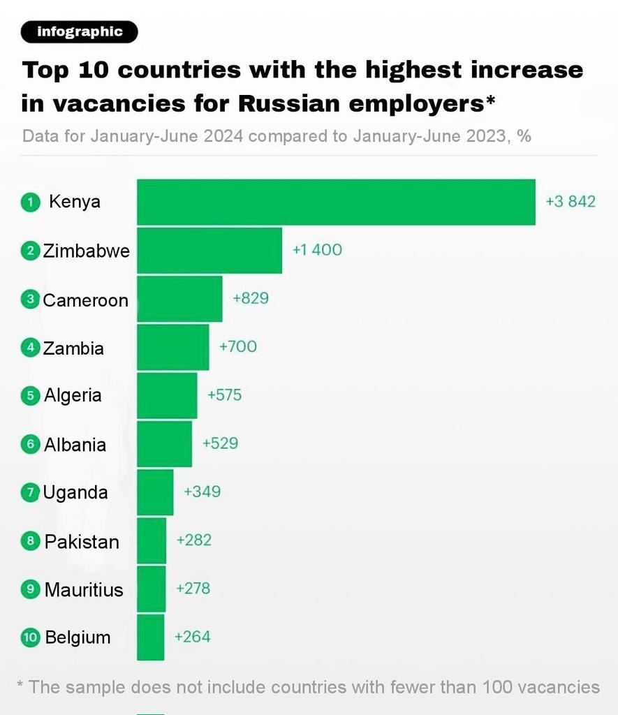 Ruské společnosti začaly kvůli nedostatku personálu aktivně nabírat zaměstnance z Afriky, vyplývá z údajů náborové služby HH. Na konci prvního pololetí vzrostl počet ruských pracovních míst v Keni 39x, v Zimbabwe - 14x, v Kamerunu - 8x, v Zambii - 7x a v Alžírsku - 5,7x. Vlastně je potřeba nevyloučit ani možnost, že oni naverbovaní zahraniční zaměstnanci neskončí v ruských závodech, ale v zákopech na Ukrajině.