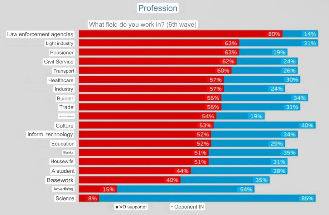 Včera večer se na ruských kanálech diskutovalo o velmi zajímavé grafice, včetně známého Zachara Prilepina. Odráží výsledky průzkumu o postojích Rusů k "vojenským akcím", vše rozděleno dle jednotlivých profesí. Jak vidíme, drtivá většina vědeckých pracovníků, tedy nejvzdělanější část populace, je proti vojenským akcím. Totéž lze říci o těch, kteří toto vzdělání získávají – téměř polovina studentů válku nepodporuje.