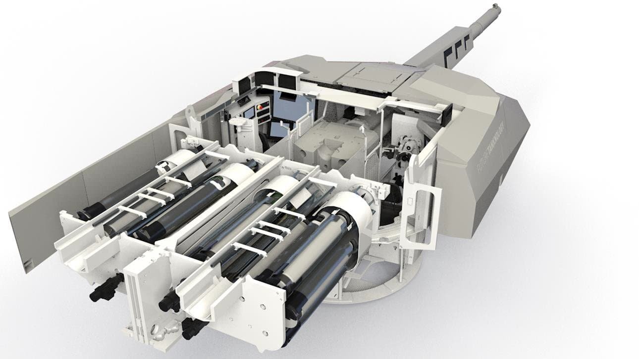 Jasně, to je ideální řešení - dá se i snadno vyměnit. Já mluvím o něčem jako na vozidle Panther (viz foto), kde šlo spíš o dronovou verzi PTŘS odpalovanou z výklopného pancéřovaného boxu ve věži. To prostě zabere místo pro celý buben s náboji - tedy polovinu vezené munice.