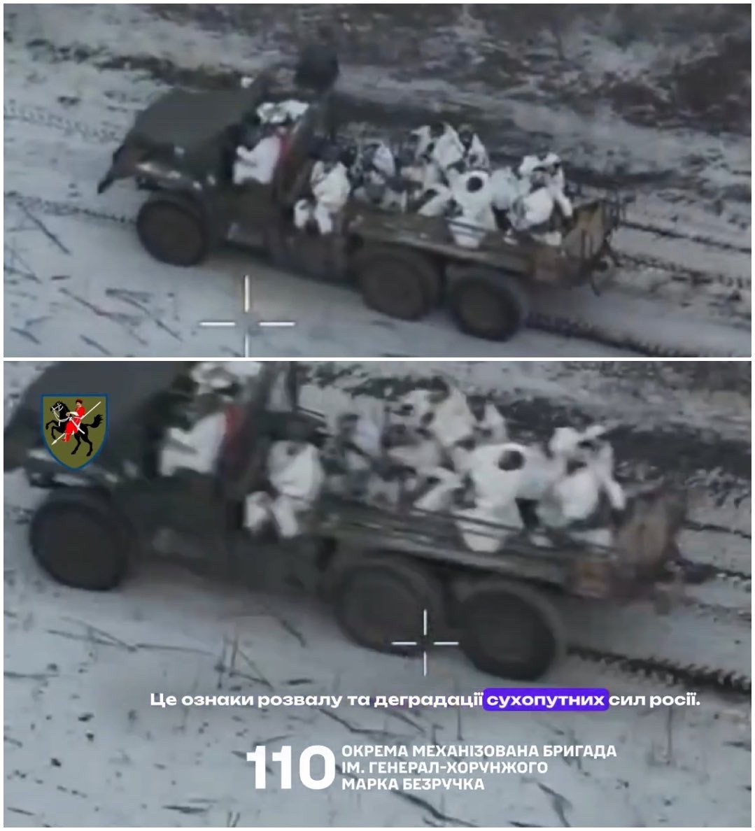 Ruský sebevražedný útok s použitím ořezaného náklaďáku Ural, se zcela odstraněnou střechou a dveřmi, naloženého pěchotou a vyslaného přímo na frontovou linii.