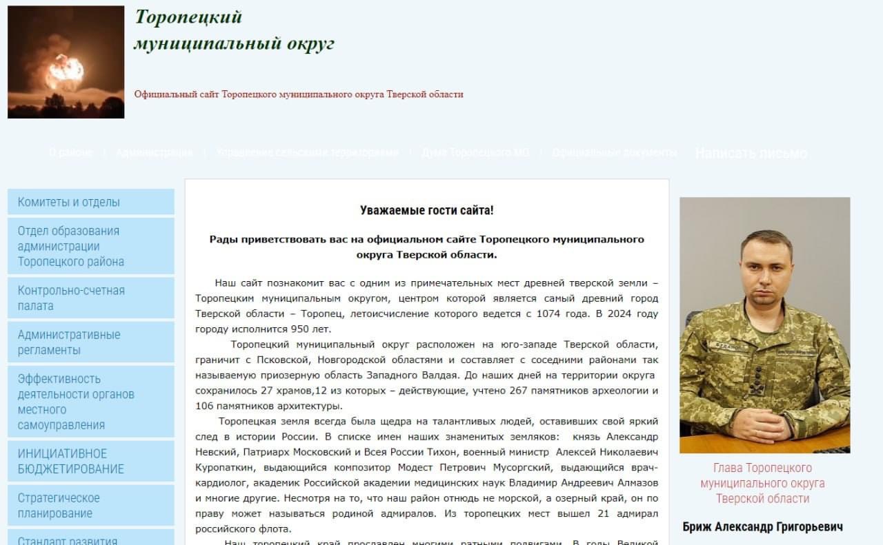 Takhle dnes dopoledne vypadaly oficiální webové stránky ruského města Toropec, kde ráno vyletěl do luftu obří muničák. Nějací dobráci tam umístili fotografii šéfa ukrajinské vojenské rozvědky generálporučíka Budanova.
