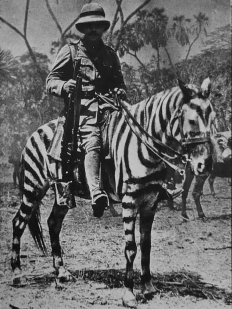 Na začátku války, se běžně přemalovávali koně maskovacími barvami. Zajímavostí ale je, že při bojích v Německé východní Africe, dostali koníci a muly černobílý nátěr. Není jisté, zda měly simulovat zebry, nebo se jednalo o podobný koncept, jako u černobílého maskování dobových válečných lodí. Na fotce níže britský voják na koni maskovaném jako zebra.