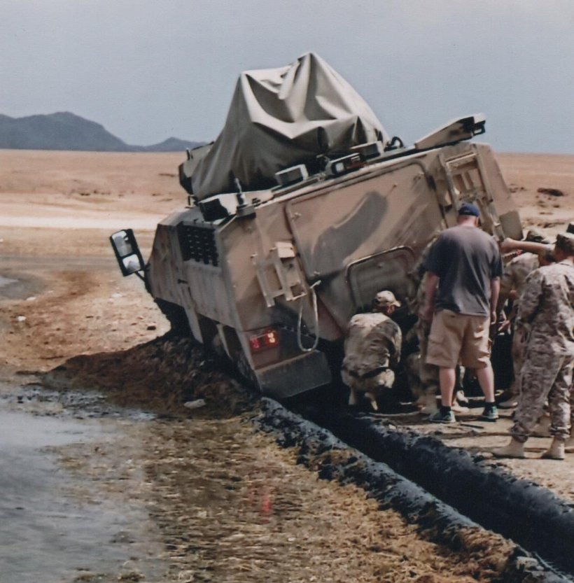 Barys 8x8 poškozený během jízdních zkoušek, kde v důsledku poruchy na podvozku došlo k odtržení kola.