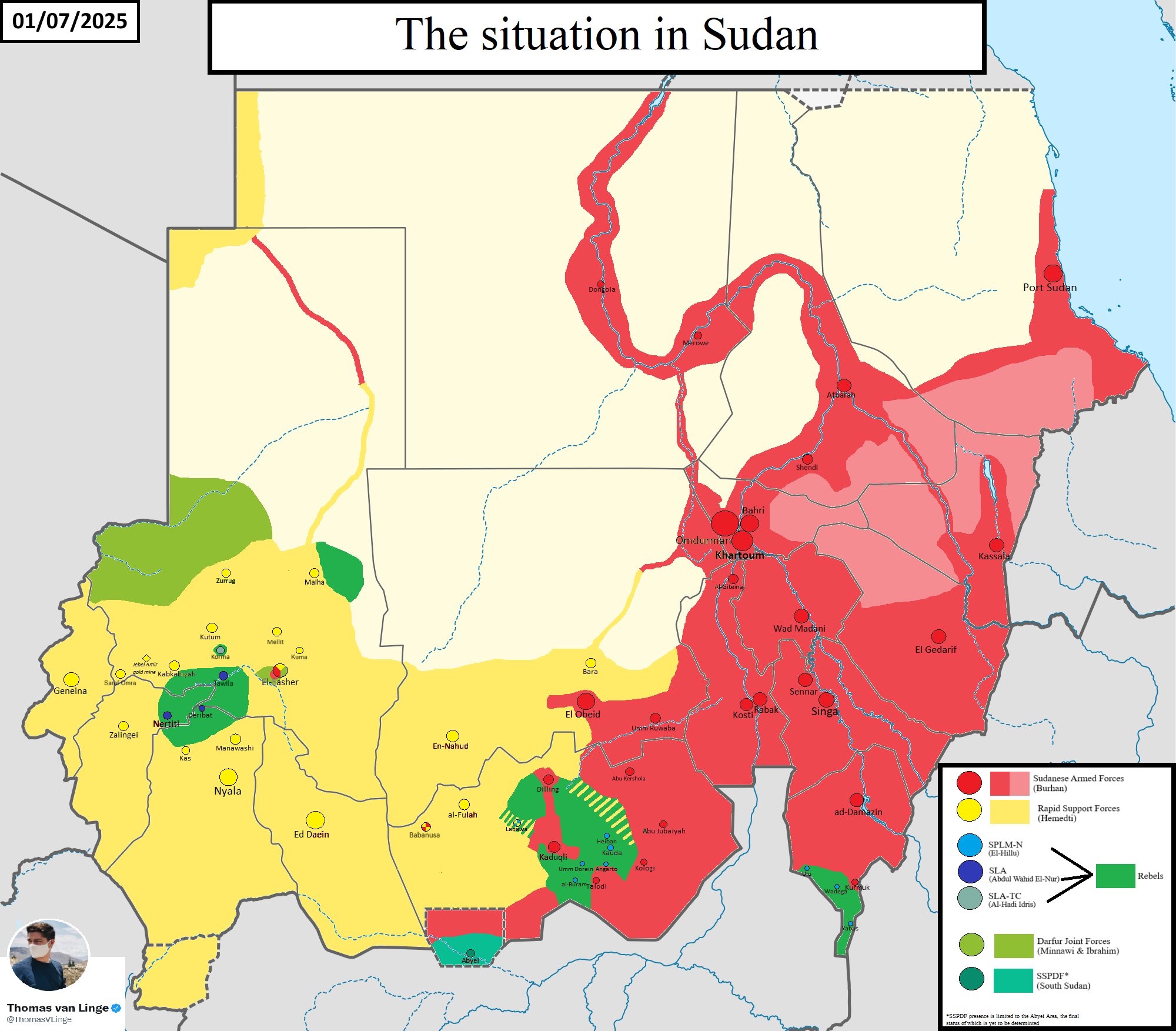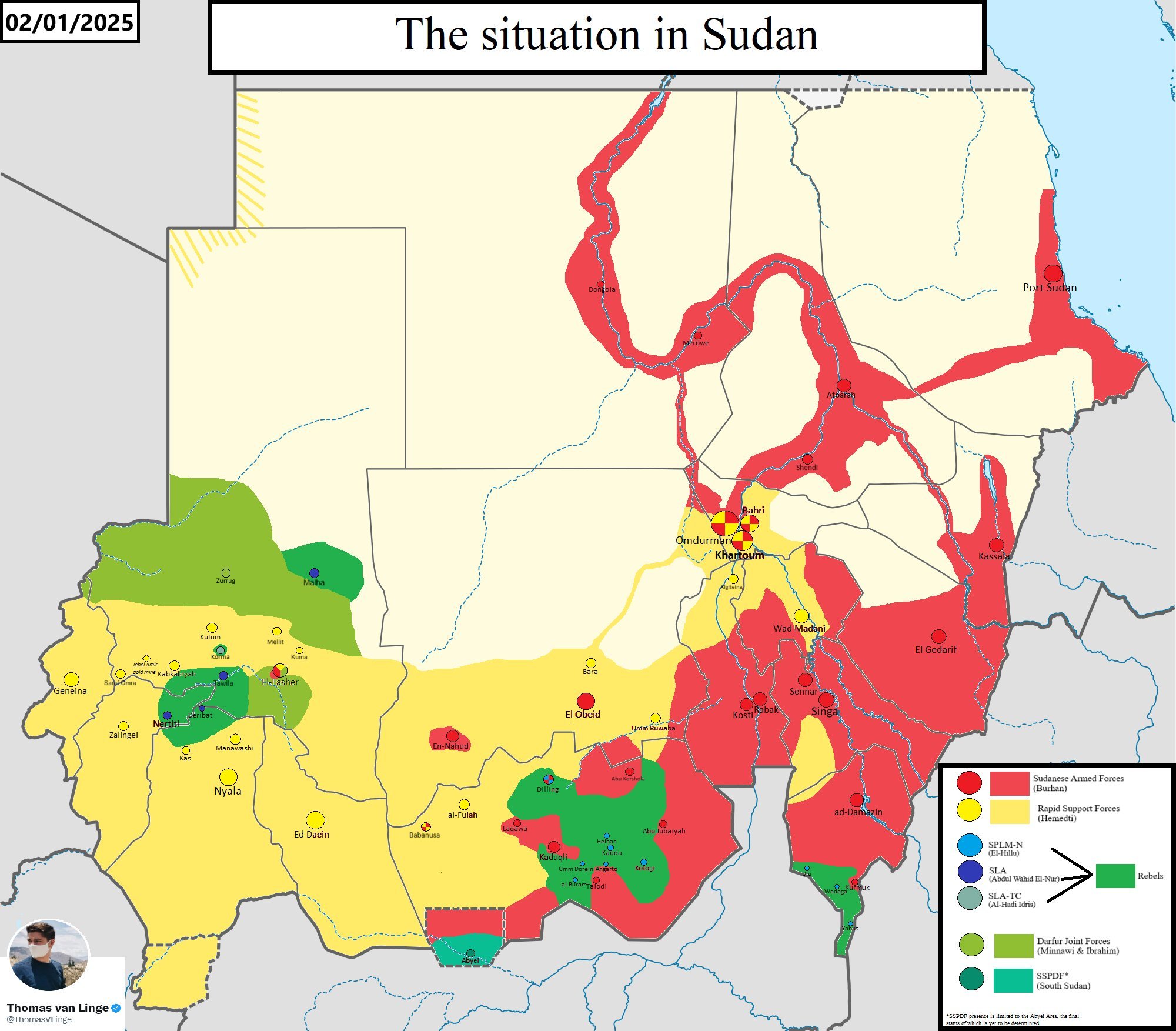 Aktuální situace v Súdánu na začátku roku 2025, nebo můžeme říct ke konci roku předešlého. V minulém měsíci SAF pokračovala v získávání zisků proti RSF a obsadila území kolem města Wad Madani. V Dárfúru ovládly Spojené síly město Zurrug.
