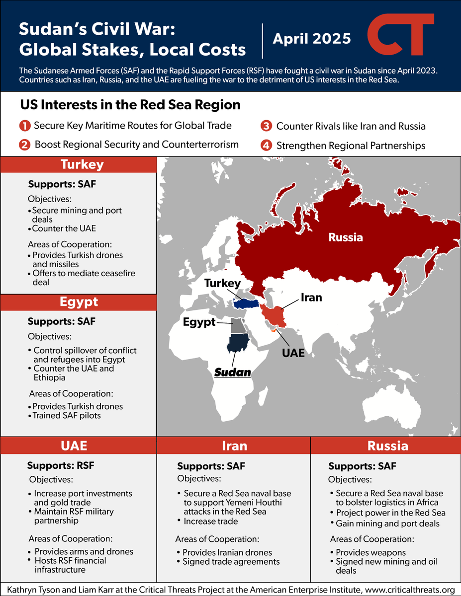 Súdánské ozbrojené síly (SAF) a Síly rychlé podpory (RSF) vedou v Súdánu občanskou válku již od dubna 2023. Země jako Írán, Rusko a Spojené arabské emiráty podporují válku na úkor zájmů USA v Rudém moři. Mezi které patří bezpečné klíčové námořní trasy pro globální obchod, posílit regionální partnerství, posílit regionální bezpečnost a boj proti terorismu, během soupeření s Íránem a Ruskem.