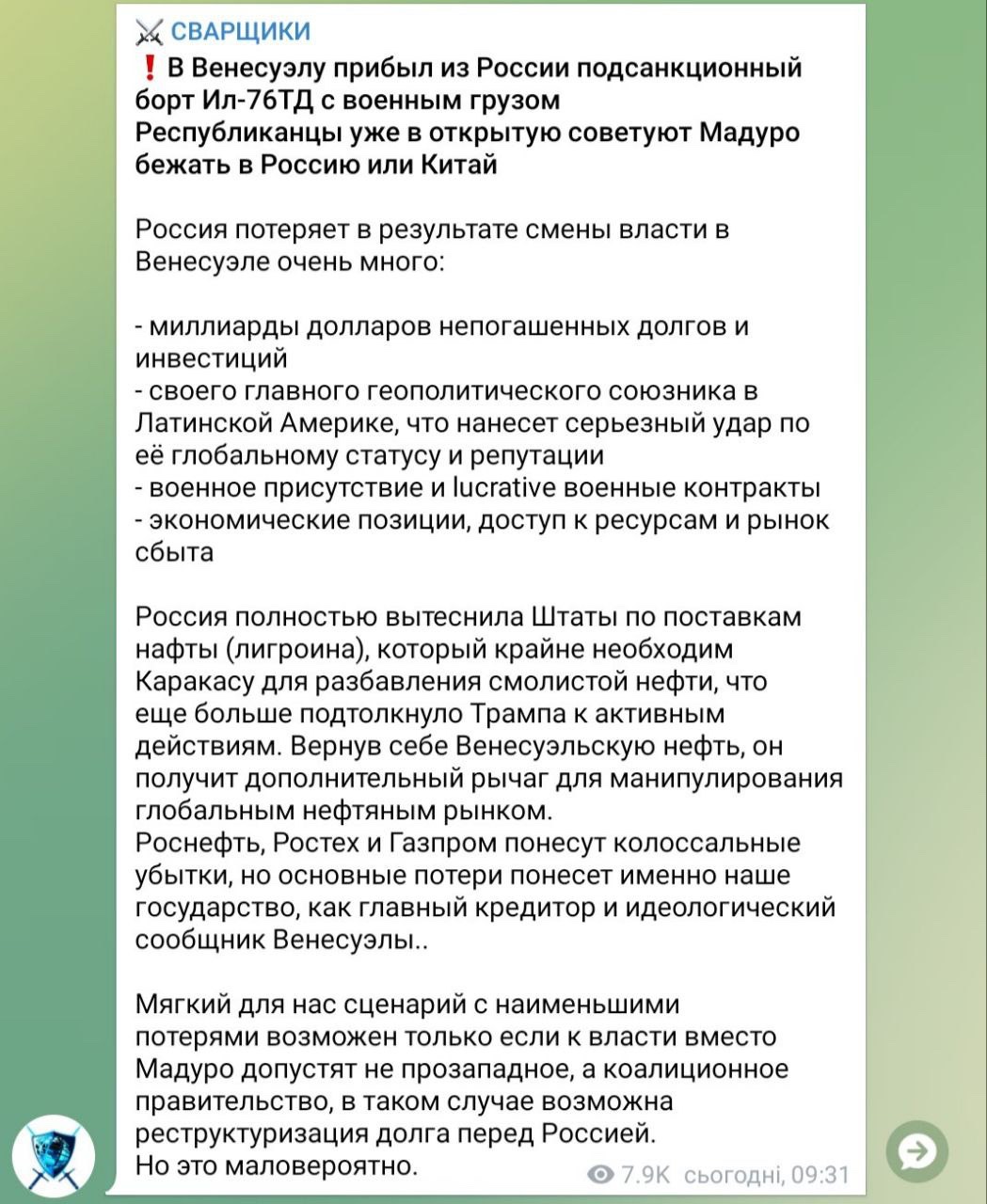Z ruských sociálních sítí: "Ve Venezuele přistál ruský sankcionovaný letoun Il-76TD s vojenským nákladem. Republikáni již Madurovi otevřeně radí, aby uprchl do Ruska nebo Číny. Rusko v důsledku změn ve Venezuele mnoho ztratí: Miliardy dolarů ztracených dluhů a investic, svého hlavního geopolitického spojence v Latinské Americe, což se vážně dotkne jeho globálního postavení a reputace, vojenské přítomnosti a lukrativních vojenských kontraktů, ekonomické pozice, přístup k zdrojům a trh se ztrátami. Rusko zcela nahradilo Spojené státy v dodávkách nafty (ligroinu), kterou Caracas zoufale potřebuje k ředění své dehtové ropy, což dále tlačí Trumpa k akci. Znovuzískáním venezuelské ropy získá další páky k manipulaci s globálním trhem s ropou. Rosněfť, Rosteh a Gazprom přinesou kolosální ztráty, ale základní ztráty přinesou právě našemu státu jako hlavnímu věřiteli a ideologickému mluvčímu Venezuely. Mírný scénář s nejmenšími ztrátami je pro nás možný pouze pokud se moci ujme koaliční vláda, nikoli prozápadní, místo Madura. V takovém případě je možná restrukturalizace dluhu vůči Rusku. To je ale nepravděpodobné."