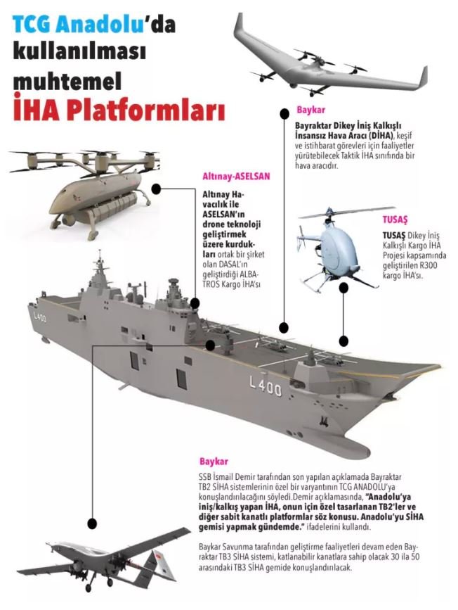 Turecko si v nedávných konfliktech vydobylo pozici jednoho ze světových lídrů ve vývoji a výrobě úderných UAV. Podle odborníků na ozbrojené síly ve světě má Turecko také všechny předpoklady stát se nesporným lídrem v oblasti použití bezpilotních letadel na námořních nosičích. Podle tureckého prezidenta Erdogana bude turecké vojenské námořnictvo v budoucnu potřebovat tři letadlové lodě. Tyto letadlové lodě Turecko údajně potřebuje pro protiletecké krytí námořnictva a především na podporu obojživelných útočných operací. Turecko již dokončilo lehkou výsadkovou útočnou loď TCG Anadolu, vycházející ze španělské třídy Juan Carlos I., s výtlakem lehce přes 27 tisíc tun.V plánu je ale rovněž stavba plnohodnotné letadlové lodi. Zatím nejsou známy podrobnosti, ale existují náznaky, že by Turecku mohla s projektem pomoci Velká Británie. Neví se zda Ankara bude stavět rovnou dvě taková plavidla najednou, nebo se omezí na stavbu jedné letadlové lodě v kombinaci se stavbou víceúčelového plavidla obdobného s Anodolu. Vzhledem k nemožnosti získat palubní letouny F-35B, rozhodli se vsadit na velké bojové drony Bayraktar TB3 (viz obrázek). K nesení až padesáti těchto dronů má být upravena již zmíněná TCG Anadolu, přičemž v jeden moment bude moct být ve vzduchu až 10 bezpilotních letounů.
