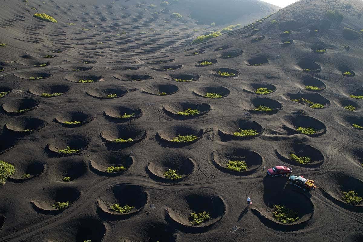 V letech 1730 až 1736 probíhaly na Lanzarote, součásti Kanárských ostrovů, mohutné sopečné erupce, které předurčily další život místních obyvatel. Základem pro pěstování révy se stal sopečný popílek, který má tu výhodu, že v noci váže vlhkost z ovzduší. Nepoužívají se zde žádné vzpěry a vinná réva se doslova plazí po zemi. Hrozny tak jsou v přímém kontaktu se sopečnou půdou. Dalším typickým místním jevem je neustálý vítr, přinášející vláhu od Atlantiku. Aby byla vinná réva proti silnému větru chráněna, sází se často do prohlubní širokých až několik metrů a dalším ochranným prvkem jsou kamenné zídky kolem. To vše vytváří charakteristický vzhled zdejší vinařské krajiny. Můžeme zde najít zhruba 2000 hektarů vinic a místní vína pravidelně vyhrávají na mezinárodních soutěžích.