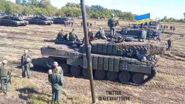 Ukrajinské tanky Leopard 2A4 (přibližně 20 kusů) osazené bloky reaktivního pancéřování K1 typu ERA. Je zde vidět též jeden BergePanzer 3 a Senator APC.