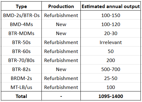Jompy analyzoval stav a produkci ruských výrobních a opravárenských závodů. Za nás je zajímavá hlavně roční produkce obrněné techniky (fungl nové a repasované). Tanky a BVP prý budou někdy příště. Níže přikládám přehlednou tabulku. Pro neangličtináře: refurbishment (rekonstrukce), new (nové).