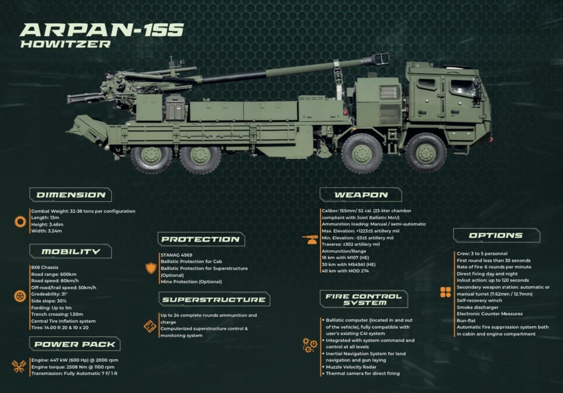 Samohybná houfnice ARPAN ráže 155 mm byla namontována na sériově vyráběné platformě taktického kolového vozidla 8×8 společnosti BMC. Systém, vyvinutý společně společnostmi ASFAT, ASELSAN, MKE a BMC, prokázal během testování působivý výkon, když vypálil osm ran za minutu – což výrazně překračuje původní cíl šesti ran.
