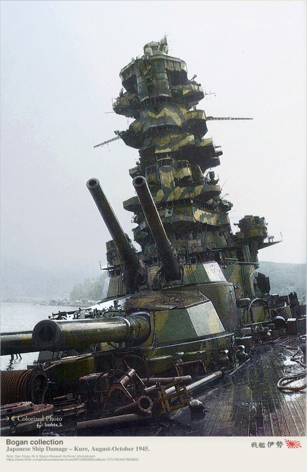 Tady je ještě záběr pagody sesterské lodě Ise po skončení války, zaujala mě ta kamufláž: