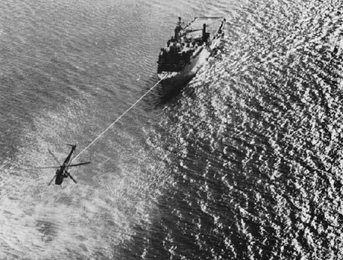 opravdu odtah nebo se děje něco jiného? 1967 - vrtulník CH-53 táhne obojživelnou dopravní loď USS Austin LPD-4 v Long Island Sound
