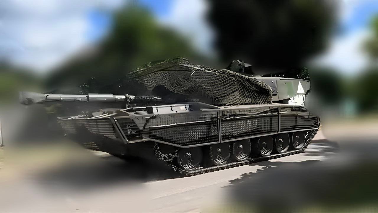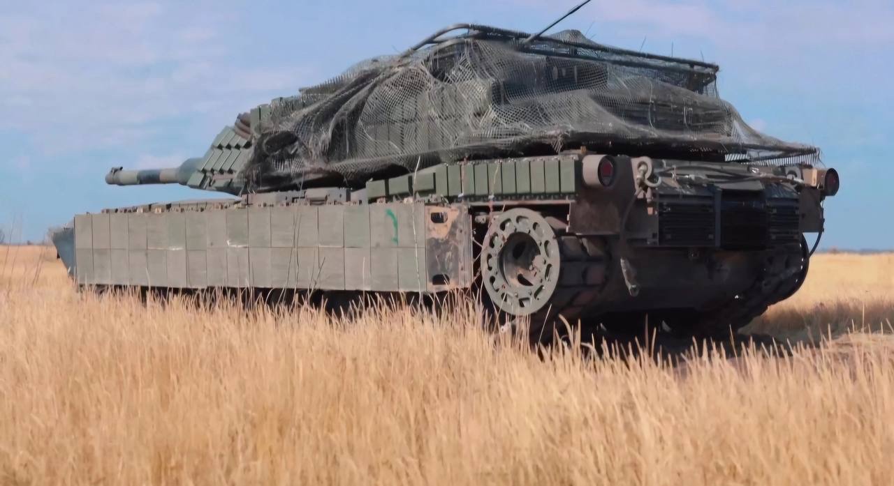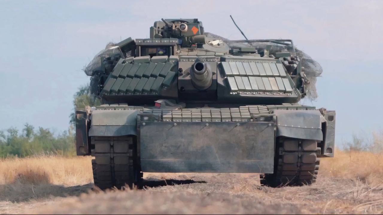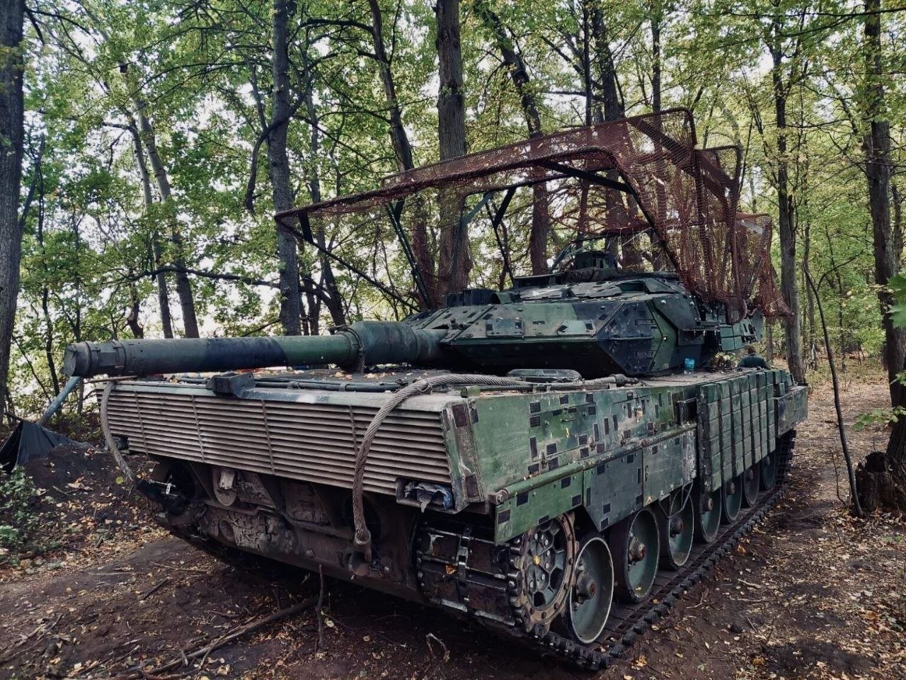 Vyladěný tank Stridsvagn 122, založený na tanku Leopard 2A5, ozbrojených sil Ukrajiny.