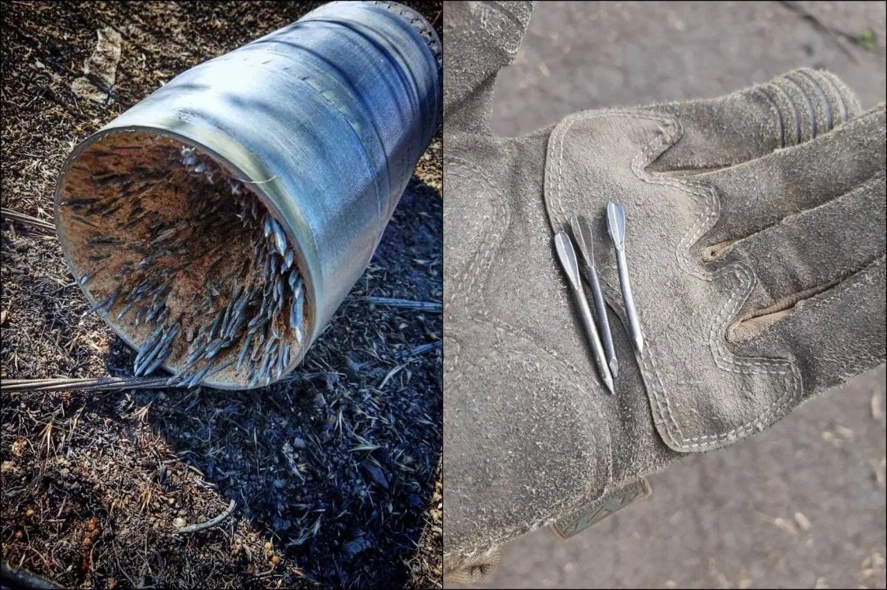 Dobré úmysly rusů krásně ilustruje tento nevybuchlý dělostřelecký granát naplněný drobnými šipkami (flešetami) podobnými hřebíkům. Jedná se o speciální protipěchotní zbraň, která se hojně používala během první světové války, kdy se shazovaly z letadel - často proti kavalerii nebo nekryté pěchotě. V současnosti se používá jako hotový projektil do střel pro tanky nebo polní děla. Úmluvy je nezakazují, ale jejich použití ve městech je porušením humanitárního práva.