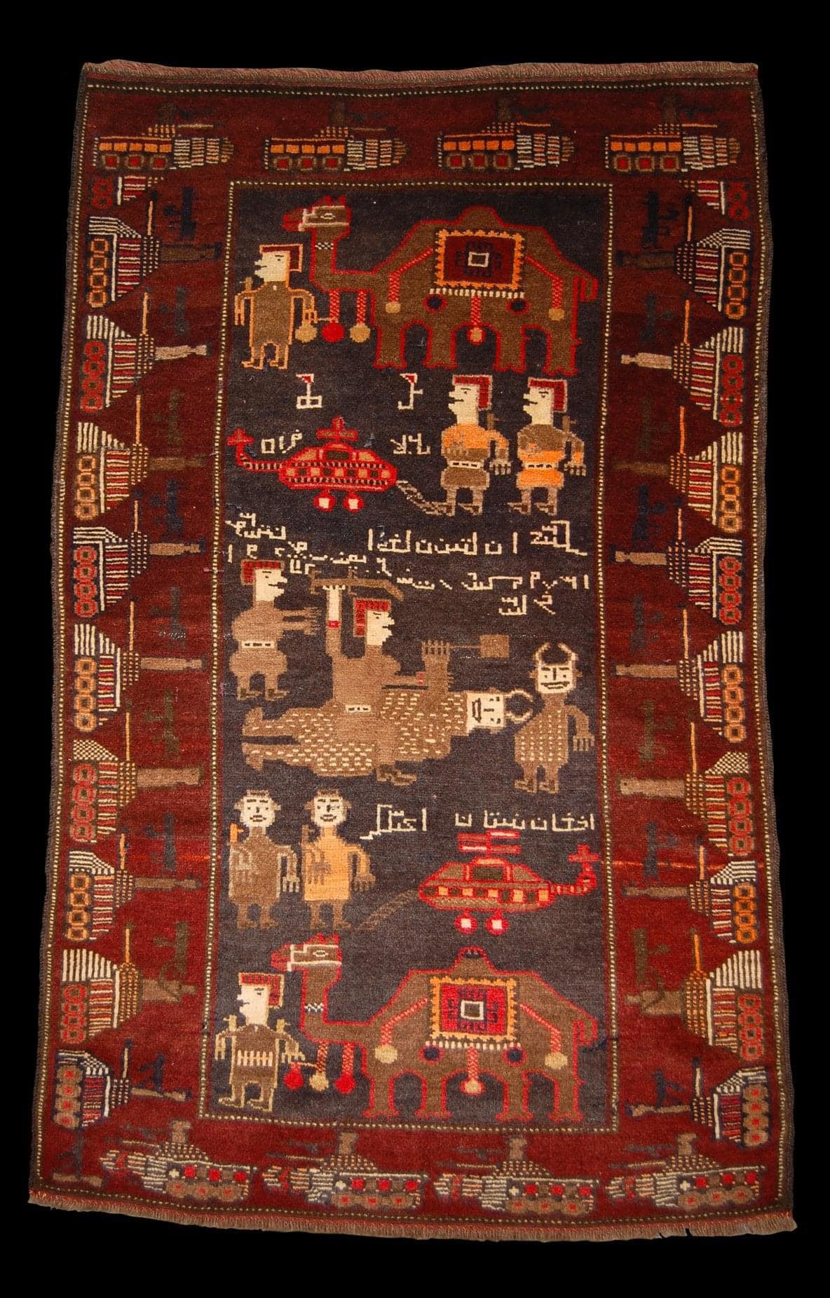 Afghánské válečné koberce jsou jedinečnou formou textilního umění, které se objevilo během sovětské okupace Afghánistánu v 80. letech a pokračovalo i v následujících letech. Tradice válečných koberců v Afghánistánu má svůj původ v desetiletí sovětské okupace od roku 1979 a pokračovala přes následné vojenské, politické a sociální konflikty. Afghánští výrobci koberců začali začleňovat válečné stroje a techniku do svých návrhů téměř okamžitě poté, co Sovětský svaz napadl jejich zemi. Tyto koberce často obsahují motivy inspirované válkou, jako je sovětská vojenská technika, vrtulníky a tanky. Jsou silným vyjádřením zkušeností, obav a nadějí afghánského lidu během těchto bouřlivých časů. Zajímavostí je, výroba těchto koberců přispěla k ekonomice Afghánistánu a poskytla příjem mnoha rodinám. Pomohlo také zachovat tradiční techniky tkaní a podpořit místní komunity. Afghánské válečné koberce získaly mezinárodní uznání a ocenění pro svou uměleckou hodnotu a historický význam. Byly shromážděny muzei a soukromými sběrateli po celém světě a slouží jako důkaz trvalé síly umění překračovat kulturní hranice a vyprávět působivé příběhy.
