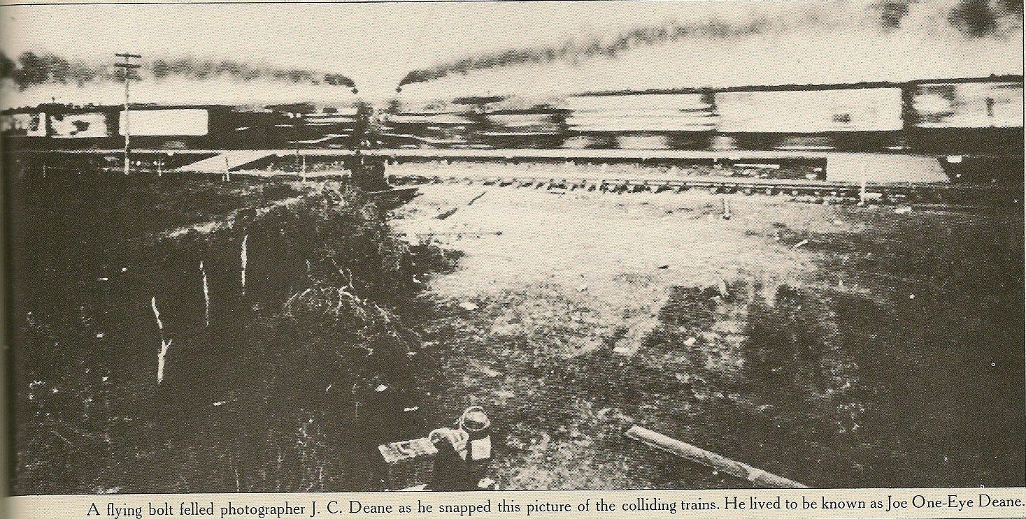 V Texasu se v 15. září roku 1896 sešlo v poušti na 40 000 lidí, aby vidělo opravdu nevídanou věc. Missoursko-texaské dráhy se totiž rozhodly předvést skutečnou srážku vlaků. Na místě tak na jeden den vzniklo improvizované městečko, druhé největší ve státě Texas. Všude byla spousta stánků, obchůdků, nevěstinec a dokonce i malé vězení. Speciálně pro tento účel byla vystavěna trať a ve vzdálenosti šesti kilometrů na ní stály dvě staré parní lokomotivy. Pak se zatopilo pod kotlem a obě lokomotivy, které táhly navíc několik nákladních vagonů, se proti sobě rozjely. Strojvůdci vyskočili. Za hrozivé rány se srazily v osmdesátikilometrové rychlosti, prolisovaly se jedna do druhé a v propojeném torzu, v surreálném objetí, se vyzvedly několik metrů nad koleje. Pak došlo k explozi kotlů. Velké úlomky kovu se rozletěly všude kolem. Dva lidé byli zabiti, několik dalších zraněno. Oficiální fotograf akce J.C. Deane přišel o oko a dál tak byl znám jako "Joe jednoočko Deane". Jeden z přihlížejících, veterán občanské války, přišel kvůli střepině o ucho. S ještě krvácející tváří však nadšeně popisoval, že to co viděl, bylo mnohem děsivější než celá bitva u Gettysburgu. Celá atrakce skončila obrovským skandálem. Tedy alespoň zdánlivě. William Crush, pořadatel celé akce, byl s okamžitou platností propuštěn. To když si jeho zaměstnavatel spočítal, na kolik celý spektákl přišel. A hned druhý den jej znovu zaměstnal. To když dostal vyúčtování a sesumírování tržeb. Rychle bylo urovnáno několik soudních sporů s rodinami obětí, zraněnému fotografovi byla škoda vyčíslena na 10 000 dolarů (v dnešních cenách 7 868 000 Kč). Reklama srážkou zabrala, noviny v celých Spojených státech psaly o události roku. Navzdory katastrofě mnoho železnic v následujících letech pokračovalo ve srážkách lokomotiv. V městečku, které pan Crush vytvořil, organizoval srážky vlaků až do roku 1916.