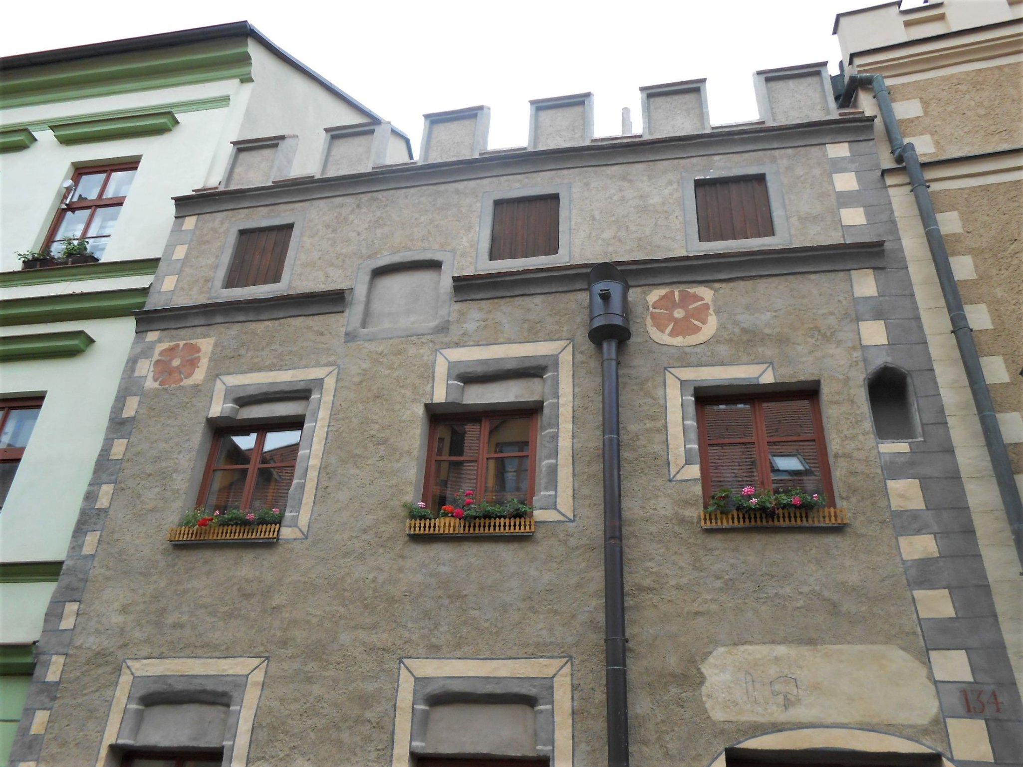 Výměna oken sice poběhla, ale klucí se tak úplně netrefili do původních rámů. Jde o pochybení památkářů nebo vzkaz od jiné, vyspělejší civilizace dávnověku? Pohodlně se usaďte, vše vám objasním. Jedná se o dům číslo popisné 134 na Horní ulici v Prachaticích. V jádru se jedná o gotický, renesančně přestavěný a dále v baroku upravovaný měšťanský dům. Na první pohled zaujme, že současná okna neodpovídají tehdejšímu renesančnímu provedení. Při rekonstrukci došlo k nálezu původních okenních otvorů a tak jsou na fasádě zvýrazněné. Byť to tedy působí na první pohled dost divně, až barbarsky, tak právě takto se to normálně dělá. Zkrátka dům prošel během několika staletí divokým stavebním vývojem. U tohoto domu se ale ještě na chvíli zdržíme. Fasádu pokrývá hrubá, pouze zednickou lžící strhávaná omítka pískové barvy s bílošedým nárožním kvádrováním a orámování okenních otvorů. Zadní průčelí domu obsahuje původní středověkou gotickou kamennou hradbu. Zajímavostí je atikové patro (až těsně pod střechou), které bylo využíváno zpravidla pro skladovací účely, popř. pro ubytování služebnictva. Boční, okenní, otvory v atice na průčelí pak sloužily jako okna, osvětlující prostor půdního patra. V tomto případě je atikové patro zdobeno cimbuřím, které má především dekorativní význam. V době, kdy se stavby pokrývaly krytinou ze spalitelných materiálů (došek, šindel), mělo ale také protipožární funkci, jelikož mohlo při požáru zabránit přelétání jisker ze sousedních hořících domů. Právě atikové střechy převládaly v Prachaticích až do 19. století. Zakonzervování renesanční podoby města způsobil zejména výrazný hospodářský úpadek po Třicetileté válce, jak ukazuje vyobrazení Prachatic z roku 1670 i pozdější malované střelecké terče z počátku 19. století. Většina atik ve městě byla odstraněna po požáru města v roce 1832 po necitlivém nařízení stavebního úřadu v Písku. Zbytky těchto atik jsou ale často dochovány v půdních nadezdívkách měšťanských domů v centru města (někdy viditelné i z půd sousedních domů).