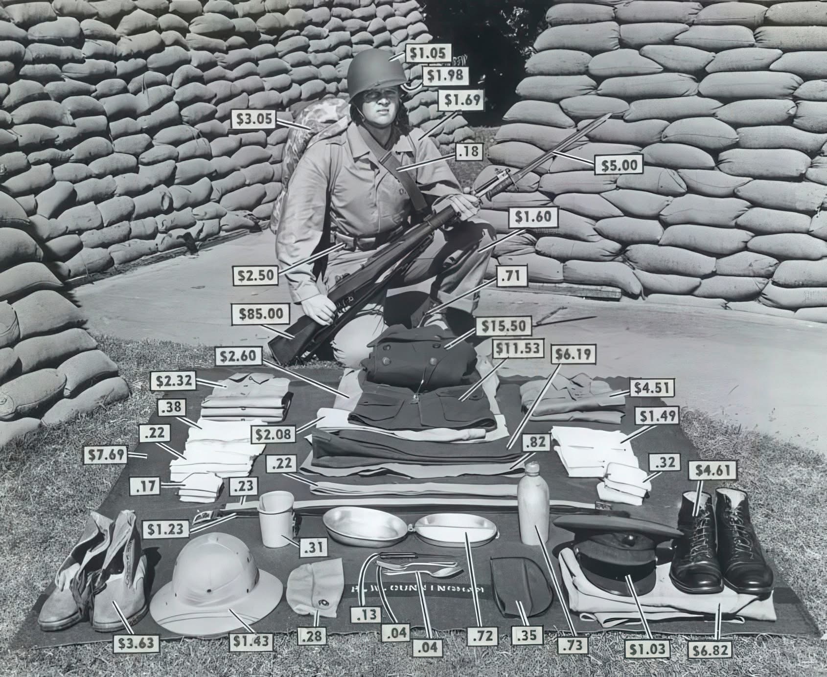 Náklady na vybavení pěšáka z druhé světové války. Pro lepší představu je hodnota 1 dolaru z roku 1942 zhruba ekvivalentem 19,49 dolaru v roce 2025. Samotná puška by tak v dnešní ceně vyšla na 1 657 dolarů (38 186 Kč).