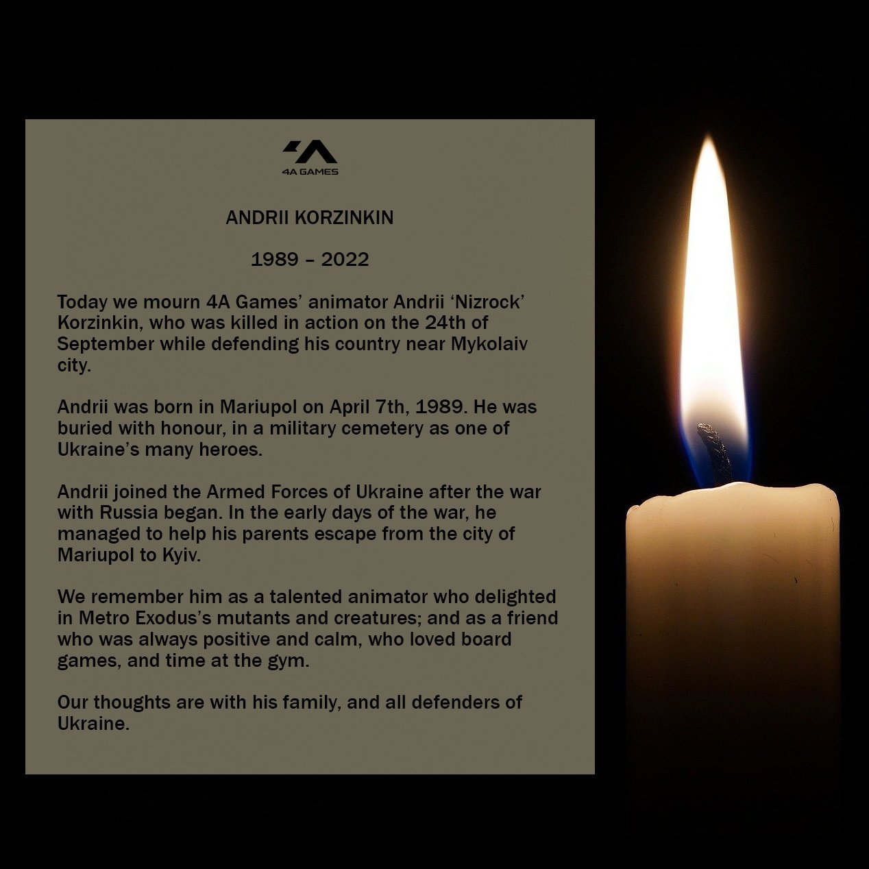 Animátor studia 4A Games Andrej Korzinkin padl při obraně vlasti 24. září poblíž Nikolajeva. Původně pocházel z Mariupolu a sloužil v řadách ukrajinské armády. Studio 4A Games, je známé sérií her Metro o postapokalyptickém rusku.
