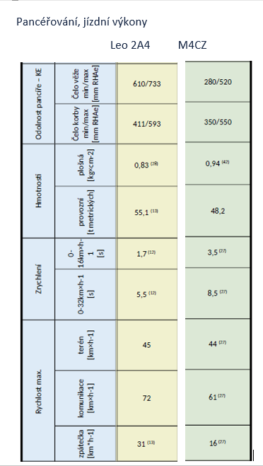 Udělal jsem výcuc ze vzájemného porovnání vycházejícího z tabulky Smutné Krabice. V podstatě jen ty nejdůležitější data, kanón jsem neřešil, krom dvojnásobné životnosti u Leopardu, není v původní tabulce nic podstatného pro stanovení jeho balistického výkonu. Jakožto penetračních parametrů munice.