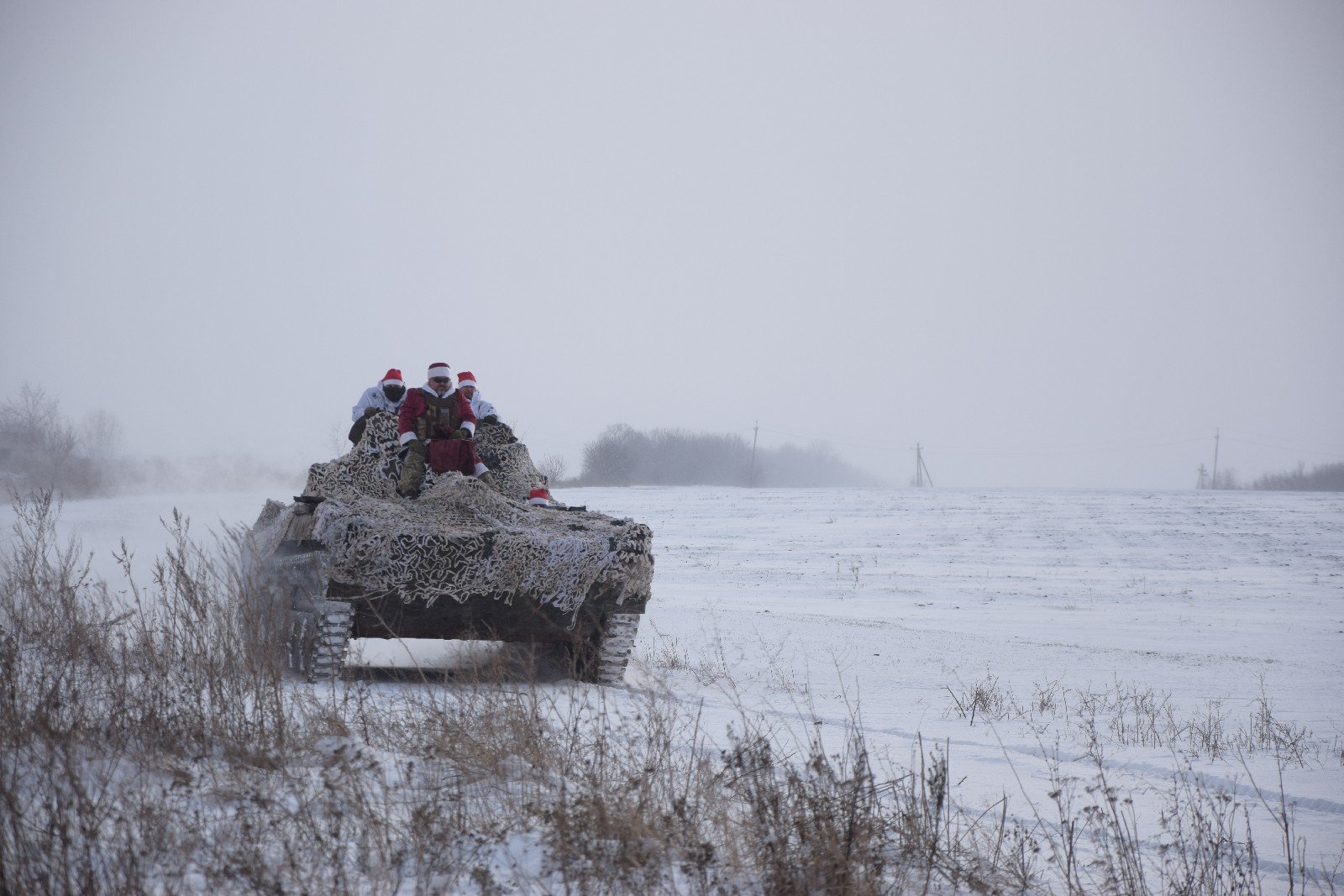 Dneska na Ukrajině Mikuláš rozváží dárečky. Za mě jsou hodně zajímavé už jen ty maskovací sítě na BMP.