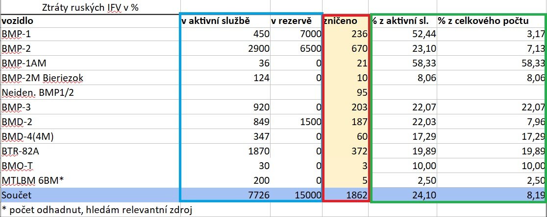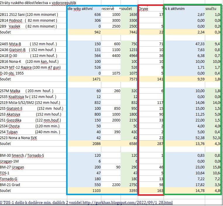 V modrém rámečku jsou početní stavy tanků vojsk RF dle jednotlivých zdrojů. V červeném jejich ztráty dle Oryxe očištěné o duplikační záznamy. A v zeleném jsou potom poměrné ztráty vždy k danému zdroji početních stavů.
