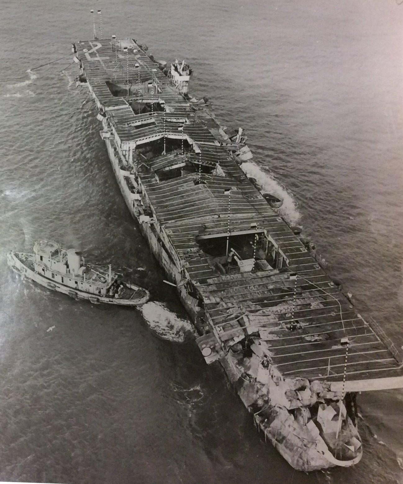 Tak, je to japonský lehký křižník Sakawa (třída Agano) při testech účinků jaderných zbraní na vyřazené válečné lodě, které proběhly v roce 1946 na atolu Bikini. Kromě svých vlastních vyřazených lodí k tomuto účelu Američané použili také kořistní japonské a německé lodě (bitevní loď Nagato a křižníky Sakawa a Prinz Eugen). Na snímku je křižník Sakawa zachycen po prvním testu (výbuch 22 kt atomové bomby nad formací lodí zakotvených v laguně atolu), epicentrum výbuchu se nacházelo cca 500 metrů za zádí křižníku, čemuž jeho stav na obrázku dobře odpovídá