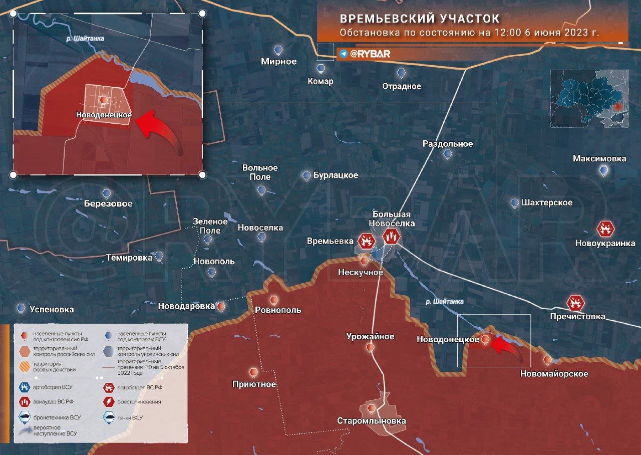 Také na levém křídle na linii Novodarovka-Rovnopol byly zaznamenány útoky nepřítele v malých skupinách. Soudě podle téměř synchronního útoku na Urožajnoje a ze směru Bolšaja Novoselka se AFU pokouší proniknout do týlu ruského uskupení na Vremjavském předmostí.