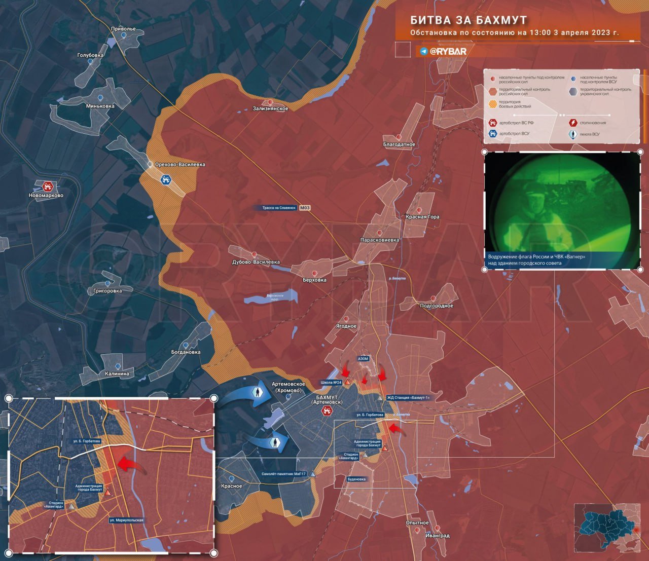 "2. apríla 2023, 23:00. Ruskú vlajku s nápisom "Vladlen Tatarsky dobrej pamäti" a vlajku PMC "Wagner" sme vztýčili na administratívnej budove mesta Bachmut. Legálne bol Bachmut zabraný. Nepriateľ je sústredený v západných oblastiach.""