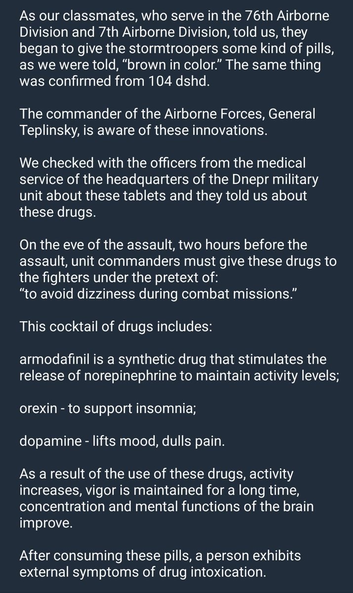 Ruský kanál napojený na VDV uvádí rozšířené používání "hnědých tablet" vyrobených z orexinu, dopaminu a armodafinilu. Ty jsou vydávány ruským vojákům před odesláním na frontu.