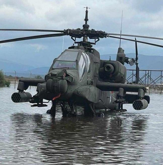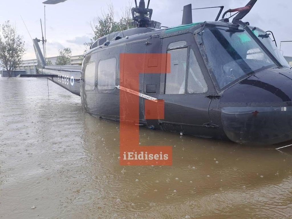 Řecké vrtulníky na základně u městečka Stefanovikio v Thesálii, po přívalových deštích co postihly Řecko.