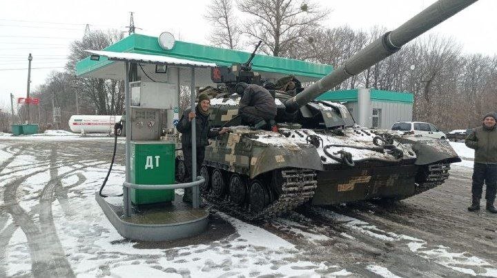 Ukrajinský tank T-64BM2 Bulat si doplňuje šťávu na benzínce kdesi v Charkovské oblasti (tuto zimu).