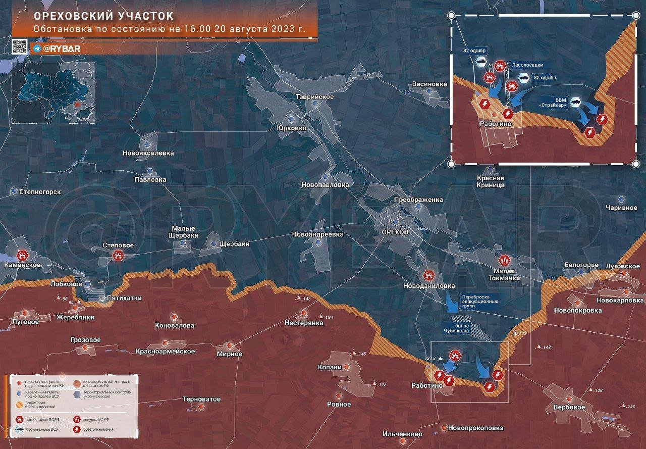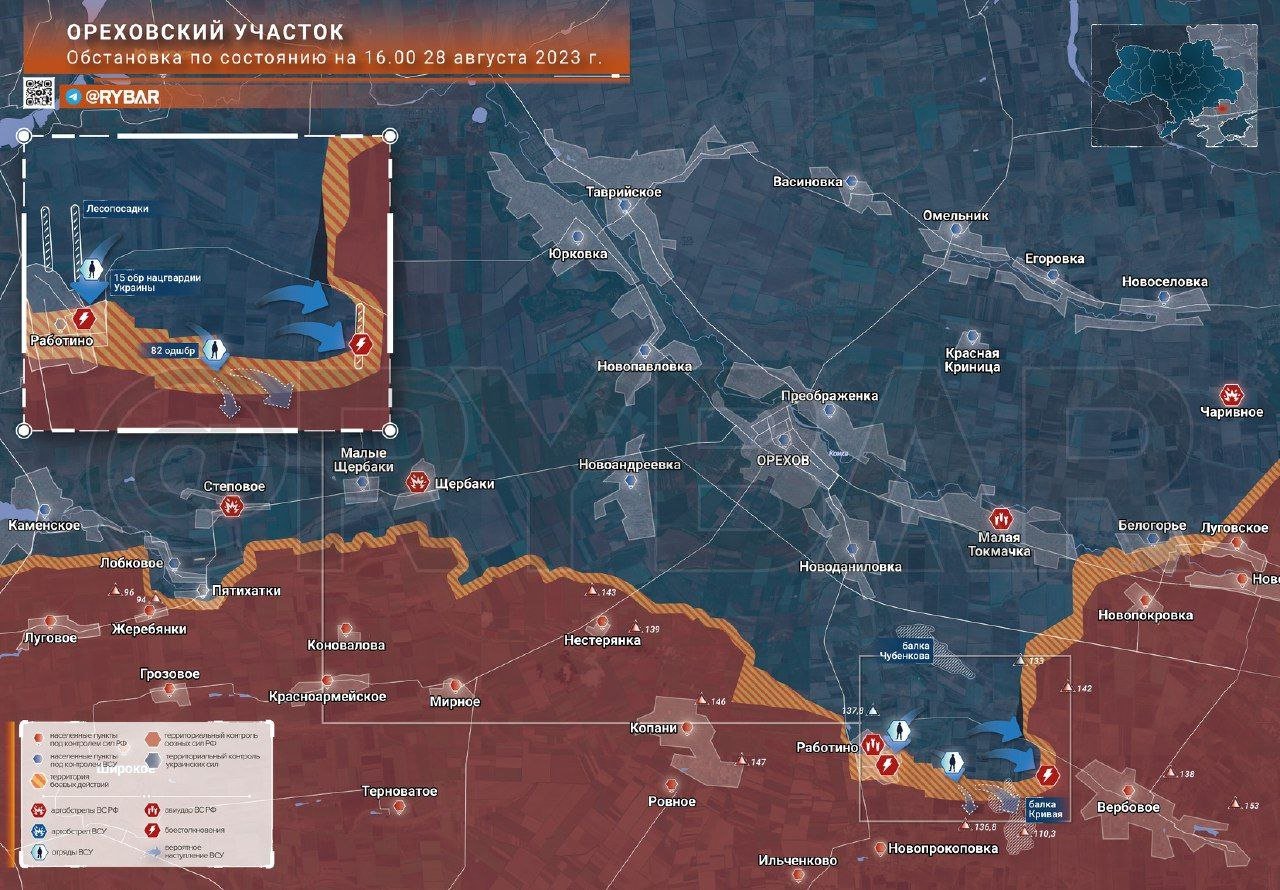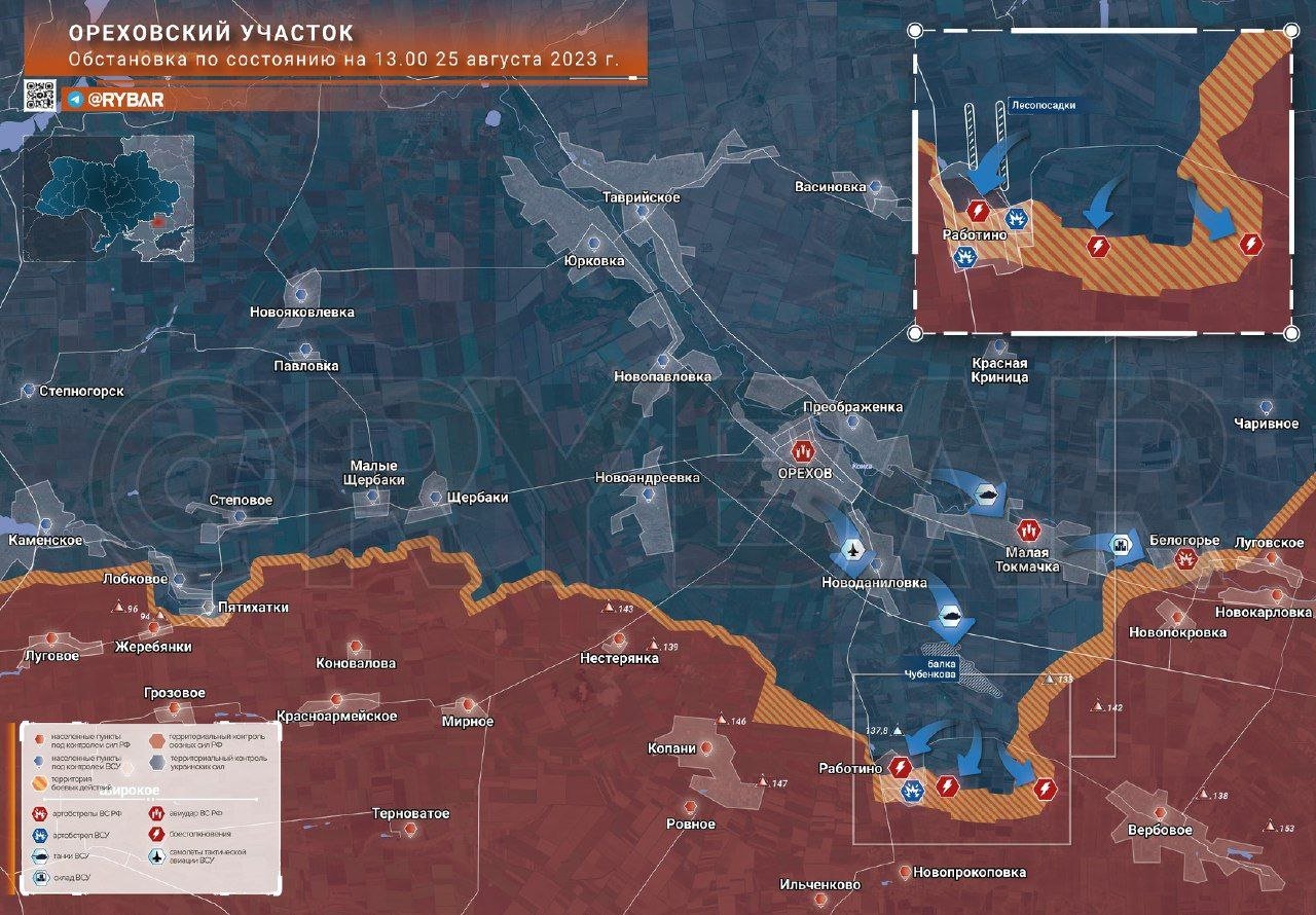 Na linii Rabotino - Verbovoje probíhají prudké boje. Situace je obtížná, protože nepřítel vrhl značné síly na dobytí Rabotina. Vesnice, respektive kontrola nad ní, se pro ukrajinské úřady stala něčím posvátným. Původně měla AFU v úmyslu získat 24. srpna opěrný bod, ale našim bojovníkům se podařilo útok odrazit.