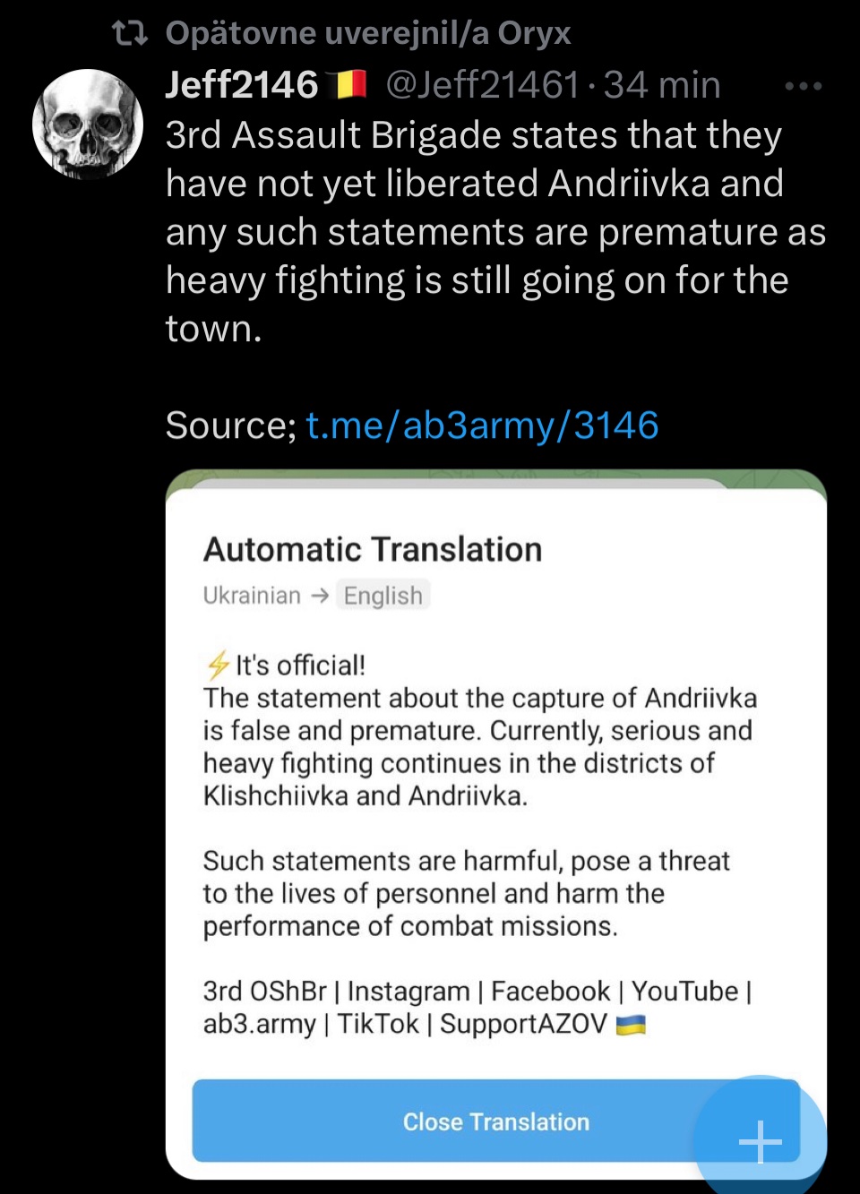 Dnes ráno UA gen staff v ranním briefingu potvrdil osvobození a i 3rd assault to potvrdila. Hádám ze včera už byla vesnice v rukou UA ale mohl probíhat nějaký protiútok/vymeteni vší. Za chvilku sem dodám zdroje