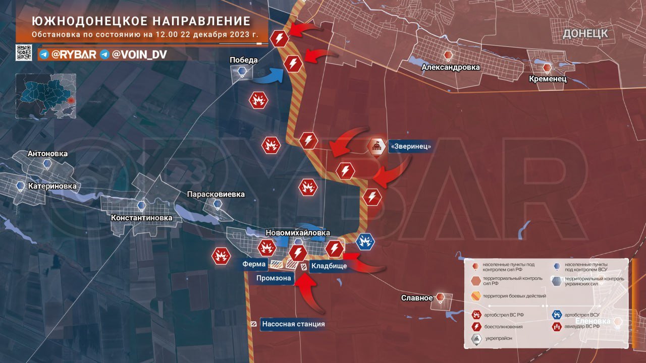 Ruské jednotky v posledních dnech pokračují v ofenzivě v trojúhelníku Poběda - opevnění " Zvěřinec" - Novomichajlovka. V důsledku úspěšného kombinovaného útoku 20. motostřelecké divize bylo dosaženo vážného úspěchu: " Zvěřinec" se dostal pod kontrolu ruských ozbrojených sil.
