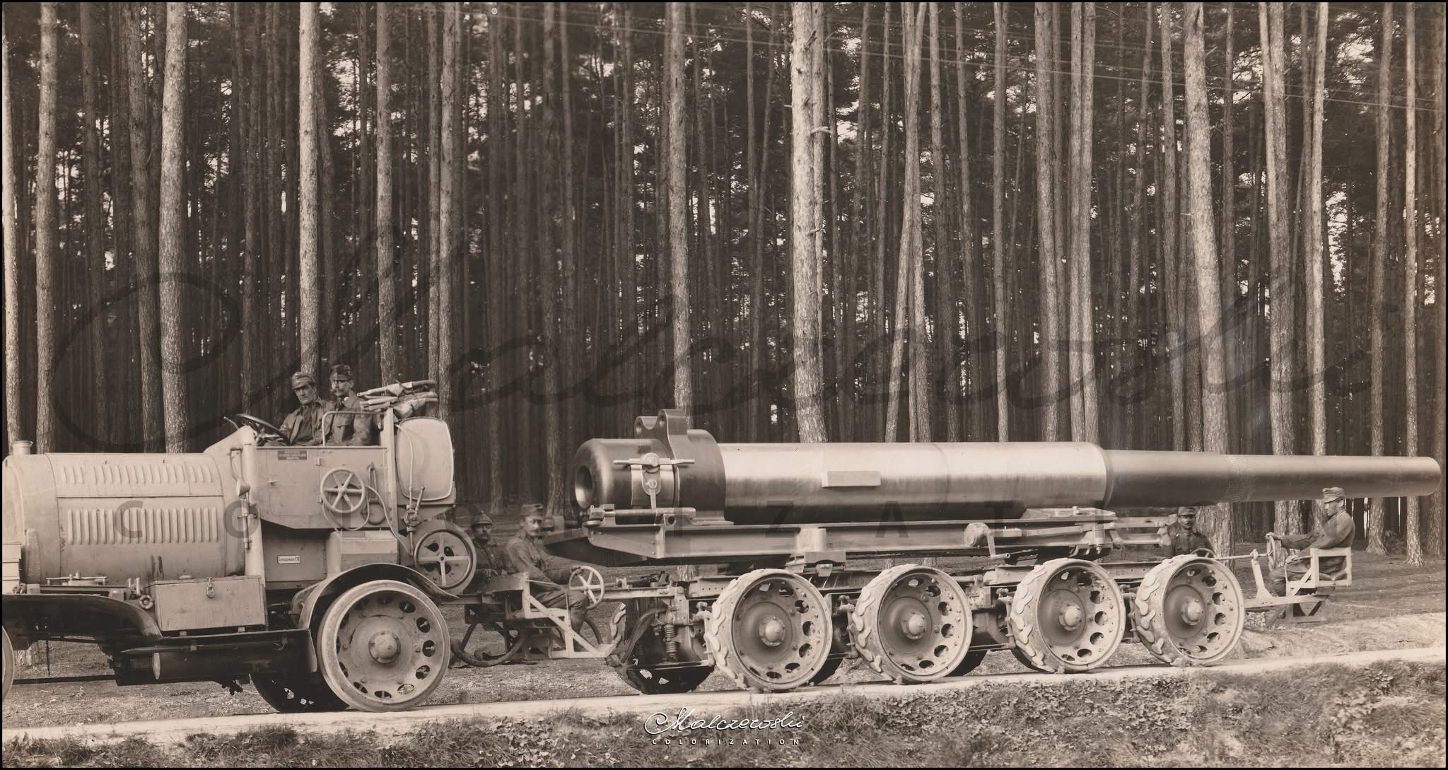 Přeprava hlavně jednoho ze dvou děl 24 cm Kanone M.16 (vyrobených během války) pomocí dělostřeleckého tahače Generatorwagen M.16.