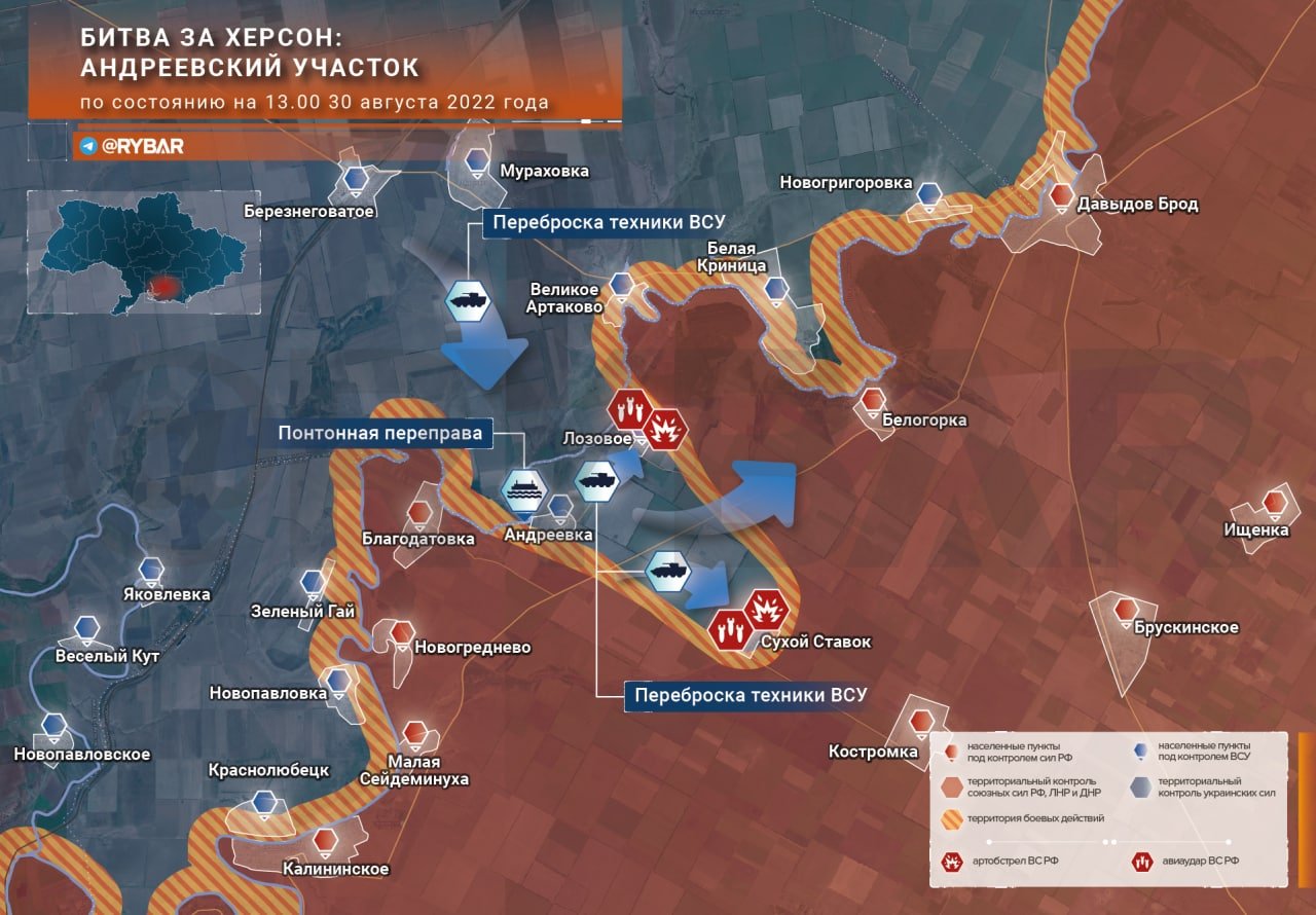 Ruským ozbrojeným silám se podařilo částečně zničit obrněná vozidla AFU přesunutá do Suchého stavoku. Nepřítel byl nucen ustoupit do zalesněné oblasti, kde se přeskupil. Silná kontrola AFU zůstává v Andreevce a Lozovoye (ano, vesnice je pod kontrolou AFU).