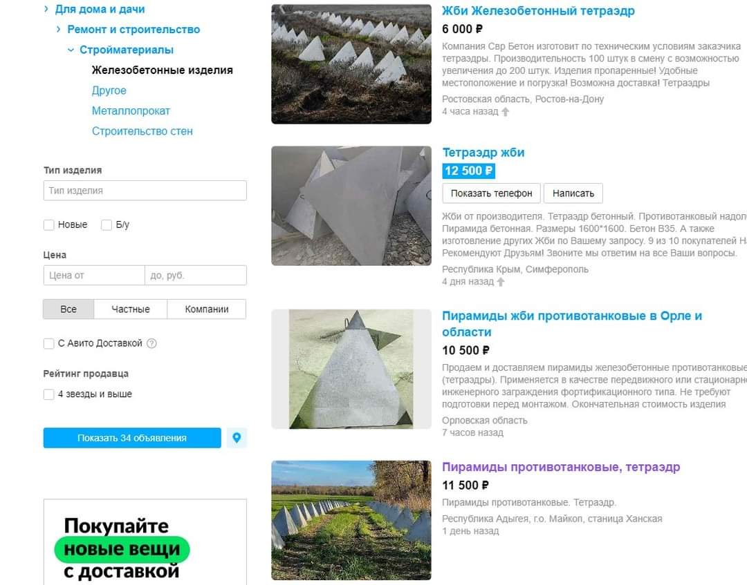 Okupanti kradou samozřejmě i svoje. Na ruském inzertním serveru Avito se masově objevují inzeráty, které jako stavební materiál nabízejí betonové protitankové zátarasy. K čemu to někomu může být, je otázka. Zátarasy vám mohou doručit do oblastí: "DNR", "LNR", Záporožská oblast, Chersonská, Smolenská, Belgorodská, Kurská nebo Brjanská oblast. Z toho je vcelku jasné, že pocházejí ze slavné ruské obranné linie. Na fotografii je ale také nákladní auto, které doručuje ve městě Orel, tj. centrální Rusko. Asi je o to zájem. Rozkradou to dříve, než se to vůbec bude muset použít.