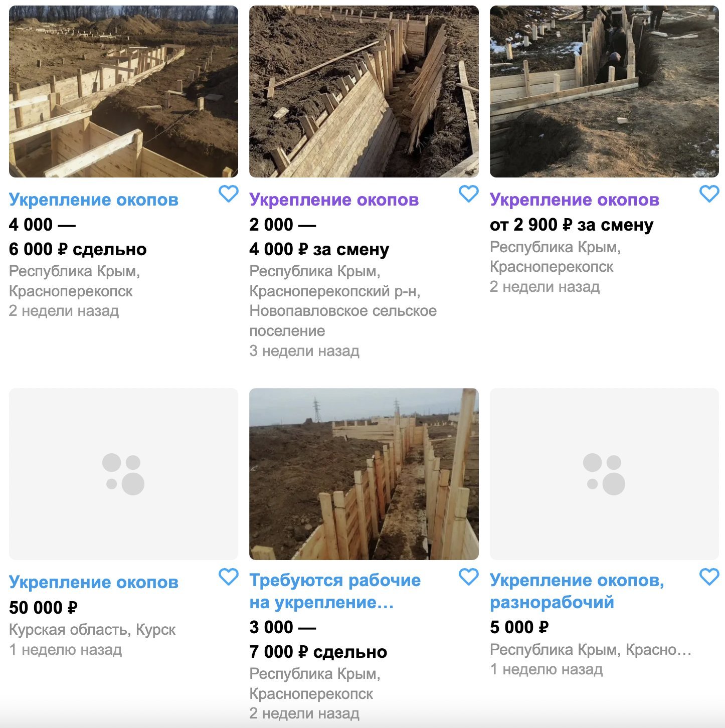 Ruští dodavatelé naléhavě hledají tesaře, dělníky a mistry pro stavbu zákopů a opevněných pozic na okupovaném Krymu. Konkrétně v okolí Krasnoperekopsku (Красноперекопськ) na strategicky důležité Perekopské šíji, která spojuje poloostrov s pevninou. Na Avitu, ruském ekvivalentu eBay, se objevily reklamy, které za práci nabízejí 2000 až 7 000 rublů (580 až 2000 Kč) denně – ale asi je v tom započítaný i rizikový příplatek. Jestli se už chcete hlásit tak pozor! Musí vám být více než 18 let, je přísně zakázáno užívání alkoholu a drog, za což hrozí propuštění bez zaplacení! Tak bachate!
