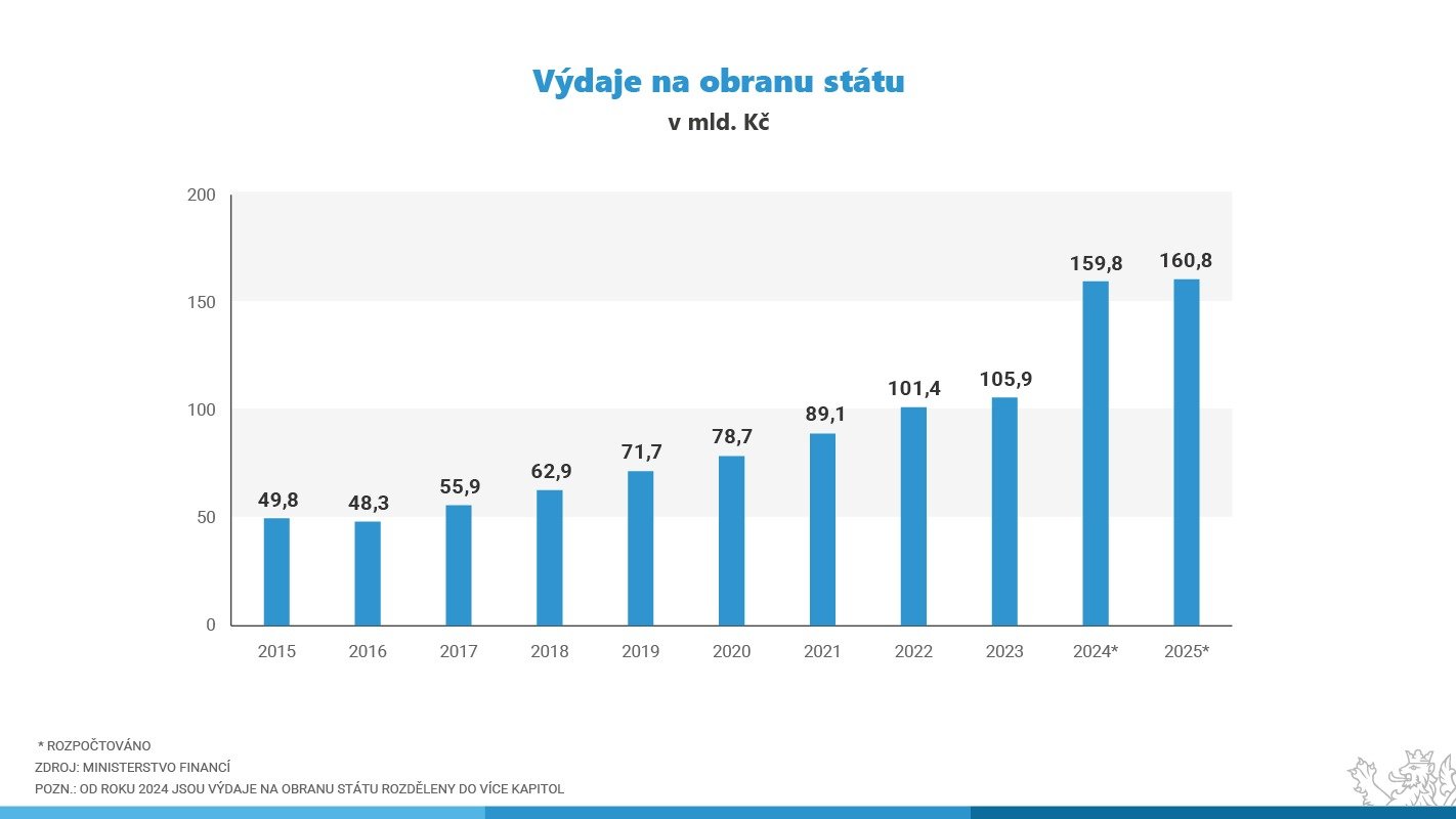 Návrh rozpočtu na příští rok počítá s obranný mi výdaji na úrovni 160,8 mld. Kč. Z toho je přímo rozpočet MO 154,3 mld. Kč.