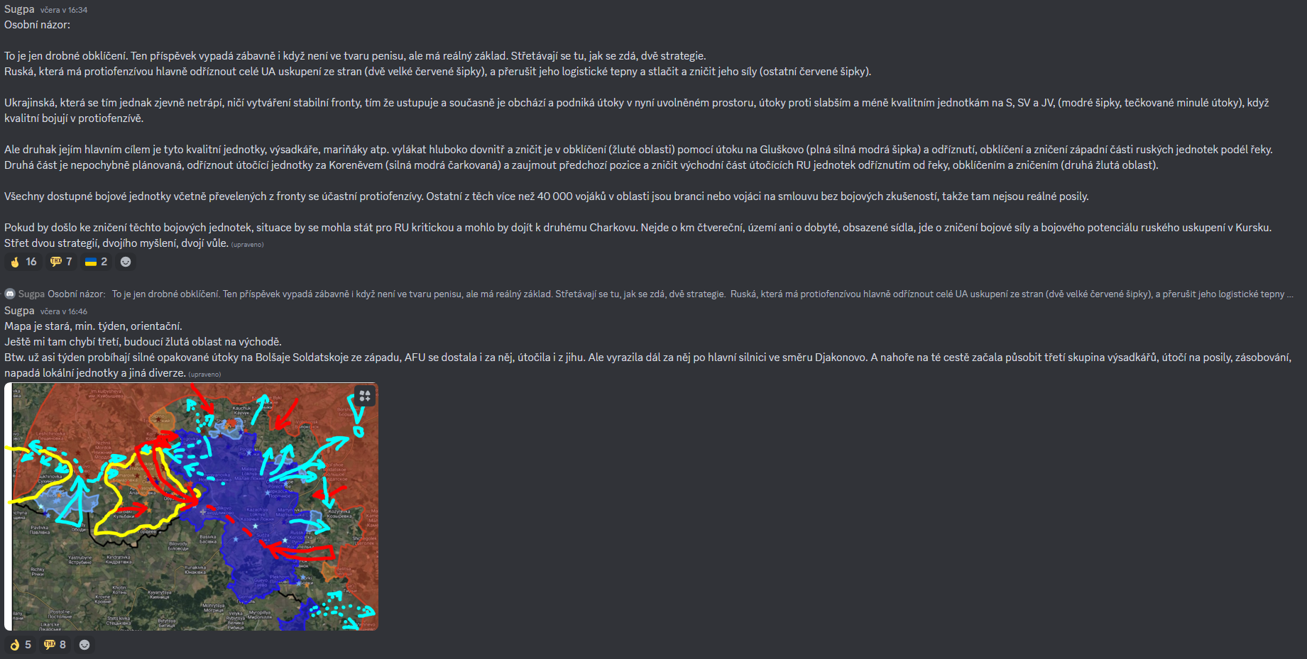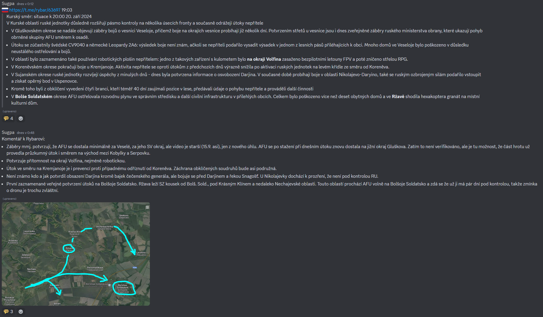 🇷🇺 https://t.me/rusich_army/17250 19:02 [útok u Bolše Soldatskoje skončil a AFU se odtamtud přesunula na sever a útočí nad Krásným Klínem a výš]