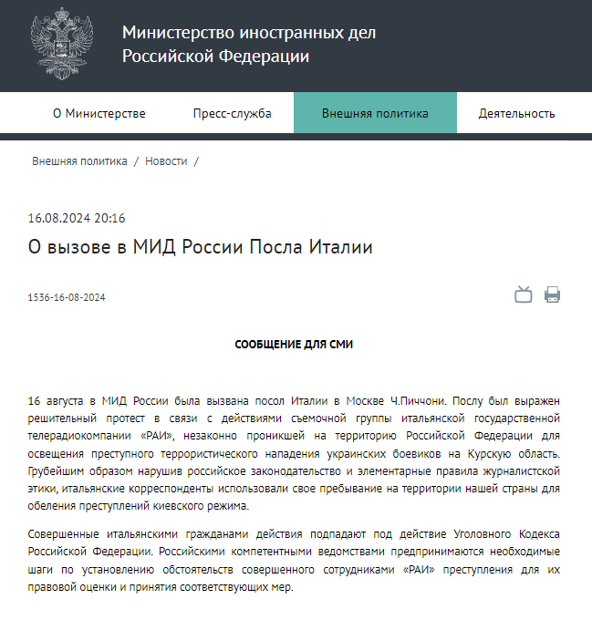 Reportáž italské televize RAI ze Sudži, ve které místní obyvatelé říkali, že se k nim ukrajinští vojáci chovají dobře, vyvolala v Moskvě úplnou hysterii. Ruské ministerstvo zahraničí si kvůli ní dokonce předvolalo italskou velvyslankyni Cecilii Piccioni.
