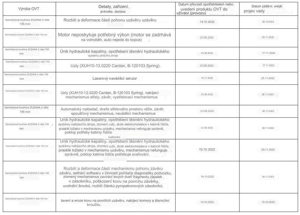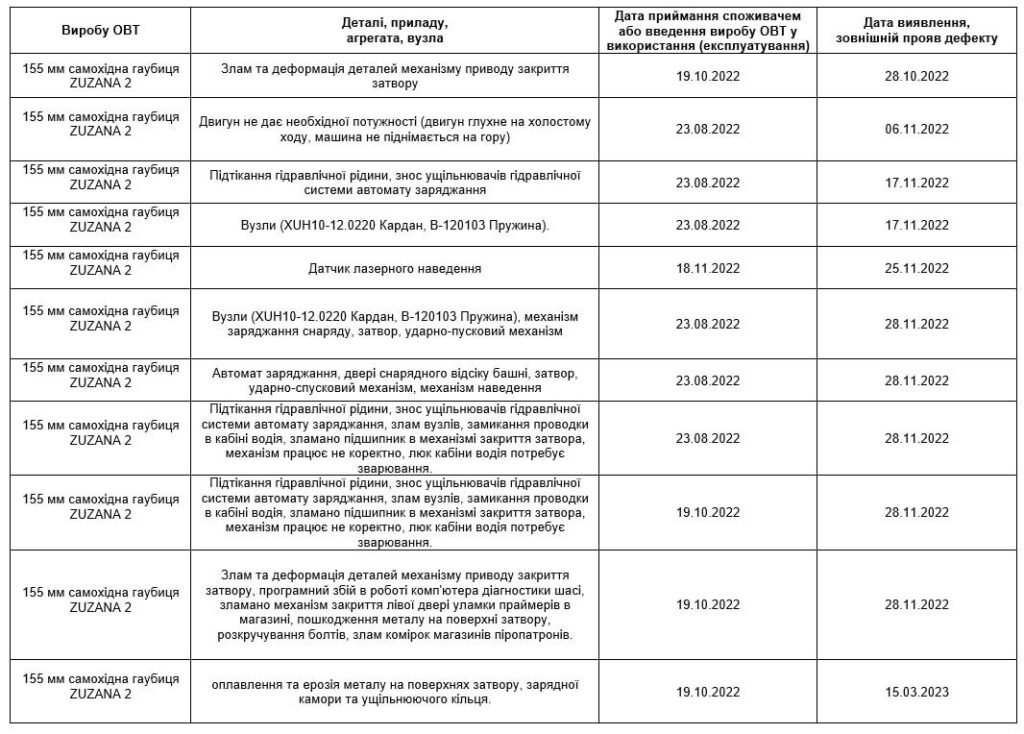 Podle zdrojových dokumentů některá z dodaných samohybných houfnic selhala již po několika dnech provozu, jiná vydržela několik měsíců. Maximální doba používání byla 1 rok a 1 měsíc, ale chybí informace o intenzitě používání tohoto stroje. Podle armády byly ve všech případech rozbité zbraně odeslány k opravě na Slovensko, ale pouze dvě z nich byly kompletně opraveny.