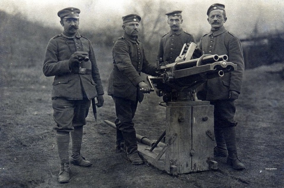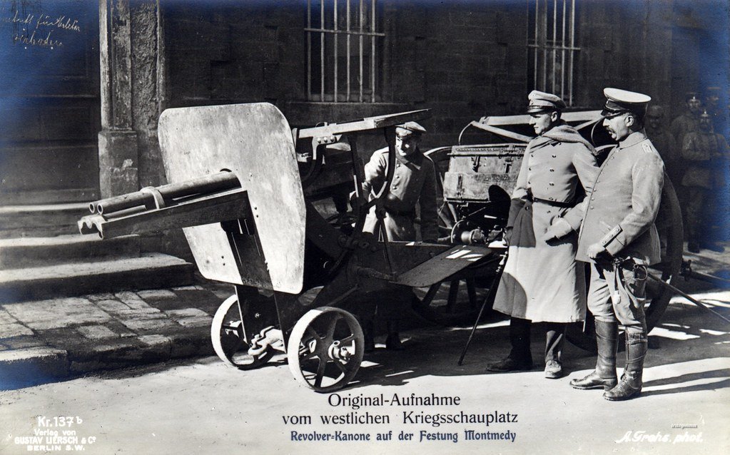Zajímavou zbraní, které se využívala ještě v průběhu první světové války, je revolverový kanón Hotchkiss vzor 1879. Kanón využíval svazku postupně nabíjených hlavní a vychází z konstrukce Benjamina Berkeleyho Hotchkisse (1826–1885) z roku 1874. Hotchkiss navrhl tuto zbraň jako reakci na prohranou francouzsko-pruskou válku a rozhodl se použít vyšší ráži než americký kulomet Gatling nebo francouzská Mitrailleuse. Cílem bylo zvýšit efektivnost proti živé síle nepřítele. Dle Petrohradské deklarace (11. prosince 1868) a Haagské úmluvy (1899 a 1907), byla nejmenší použitelnou ráži, u níž bylo ještě možno použít výbušný projektil, právě ráže 37 mm (1,5 "). Konstrukce tedy byla založena na nové nedělené munici 16oz ráže 37 mm, později vznikly i kanóny ráže 47 a 53 mm. Pět hlavní bylo uloženo kolem společné osy, pomocí kliky se postupně nastavovaly do podávacího ústrojí, přičemž byly nabíjeny a po uzavření závěru odpáleny. Rám spolu s pouzdrem závěru byly vyrobeny z bronzu, což zvyšovalo cenu celé zbraně. Náměr se uděloval pomocí šroubového mechanismu. Svazek rotačních hlavní umožňoval vyšší rychlost střelby než běžné kanóny této ráže, rychlost střelby dosahovala kadence 30 až 60 ran za minutu. Zde si můžete přečíst celý manuál ke kanónu Hotchkiss. Výroba těchto zbraní probíhala především u zbrojovky ve francouzském Puteaux. Revolverový kanón Hotchkiss byl určen jako kasematový kanón pro zabudování do nově budovaných pevností, na kolové lafetě pro pozemní jednotky, nebo pro námořnictvo k obraně proti torpédům a torpédovým člunům. V této roli Hotchkiss soupeřil s lehčími mechanickými kanóny, jako Nordenfelt a Gardner. Impozantní byla spolehlivost této nové zbraně. Během amerických zkoušek v letech 1876 a 1877 bylo z představeného revolverového rotačního kanónu Hotchkiss, vypáleno celkem 1 136 nábojů, přičemž došlo pouze k pěti poruchám. Jednou bylo selhání zápalky u projektilu a u dalších čtyř se jednalo o vadu na pružině úderníku, přičemž došlo k její výměně a po této opravě nebyly zaznamenány žádné další problémy. Jednalo se o opravdu skvělý výsledek a přítomní důstojníci byli oprávněně ohromeni. Velkého uznání si vysloužila i výrobní a konstrukční kvalita představeného kanónu Hotchkiss. Americká armáda je nasadila již při Masakru u Wounded Knee (1890) a za španělské války na Kubě (1898). Revolverové kanóny Hotchkiss se rozšířily do všech koutů světa, včetně Brazílie, Francie, Číny, USA, Holandska, Řecka, Chile, Argentiny, Ruska a Dánska.