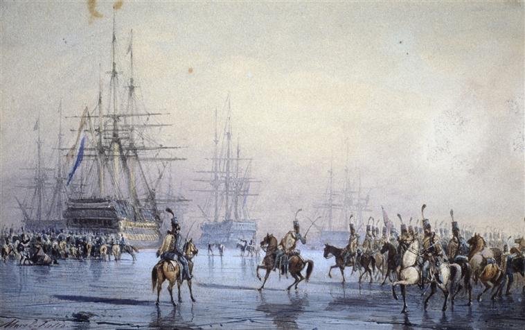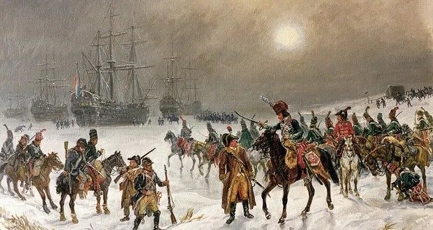 K neskutečně kuriózní události došlo v noci 23. ledna 1795. Tehdy se francouzským husarům podařilo zabrat holandskou flotilu zamrzlou poblíž přístavu Den Helden. Zabráno bylo celkem 14 lodí s celkem 850 děly na palubě (!) a celá událost se obešla bez ztrát na životech. K události došlo během Války první koalice - což byl první pokus evropských monarchií porazit revoluční Francii. Francie vyhlásila válku Habsburské monarchii 20. dubna 1792 a Prusko se přidalo o několik týdnů později. Jednalo se o součást série válek v letech 1792 až 1802, označované jako Francouzské revoluční války. Velitelem francouzské armády, při invazi do Holandska, byl generál Jean-Charles Pichegru. Samotná kampaň byla zahájena na podzim 1794 a jeho armáda vstoupila do Amsterdamu 19. ledna 1795, kde se rozhodla přezimovat. Pichegrovi se podařilo zjistit, že holandská flotila byla tou dobou zakotvena v přístavu Den Helder, přibližně osmdesát kilometrů severně od Amsterdamu. Přístav Den Helden se nacházel až na samé severní špičce Holandska, jižně od ostrova Texel. Mezi nimi se nacházela mělká zátoka zvaná Zuiderzee. Ta byla ve 20.století přehrazena, čímž vzniklo sladkovodní jezero. Zpět ale k tématu. Pichegru neprodleně nařídil brigádnímu generálu jménem Jan Willem de Winter (1761-1812) aby se pokusil tyto lodě zajistit. Velice trefné je jméno tohoto vojáka, které by se dalo přeložit jako „generál Zima“, a právě zima měla Francouzům dopomoci k zářnému vítězství. Samotný de Winter pocházel z holandského Kampenu a ve francouzských službách sloužil od roku 1787, k provedení úkolu mu bylo svěřeno velení nad 8. husarským plukem. Francouzům se podařilo k Den Helden dorazit v noci z 23. ledna a zajímavostí je, že každý jezdec s sebou na koni vezl rovněž pěšáka z 15. pluk řadové pěchoty. Nizozemská flotila čítající 14 lodí, se nacházela v přístavu přesně dle informací a v pohybu jí bránil pevný led. Stále ale nebylo vyhráno, jelikož na lodích se nacházelo celkem 850 děl (!) Jelikož bylo nutno nepřítele překvapit a neprobudit spící námořníky, byla koňská kopyta opatřena návleky z látky a slámy. Útok vedl podplukovník Louis Joseph Lahure. Led zůstal pevný, nepřítele se podařilo překvapit a flotilu se podařilo obsadit beze ztrát.