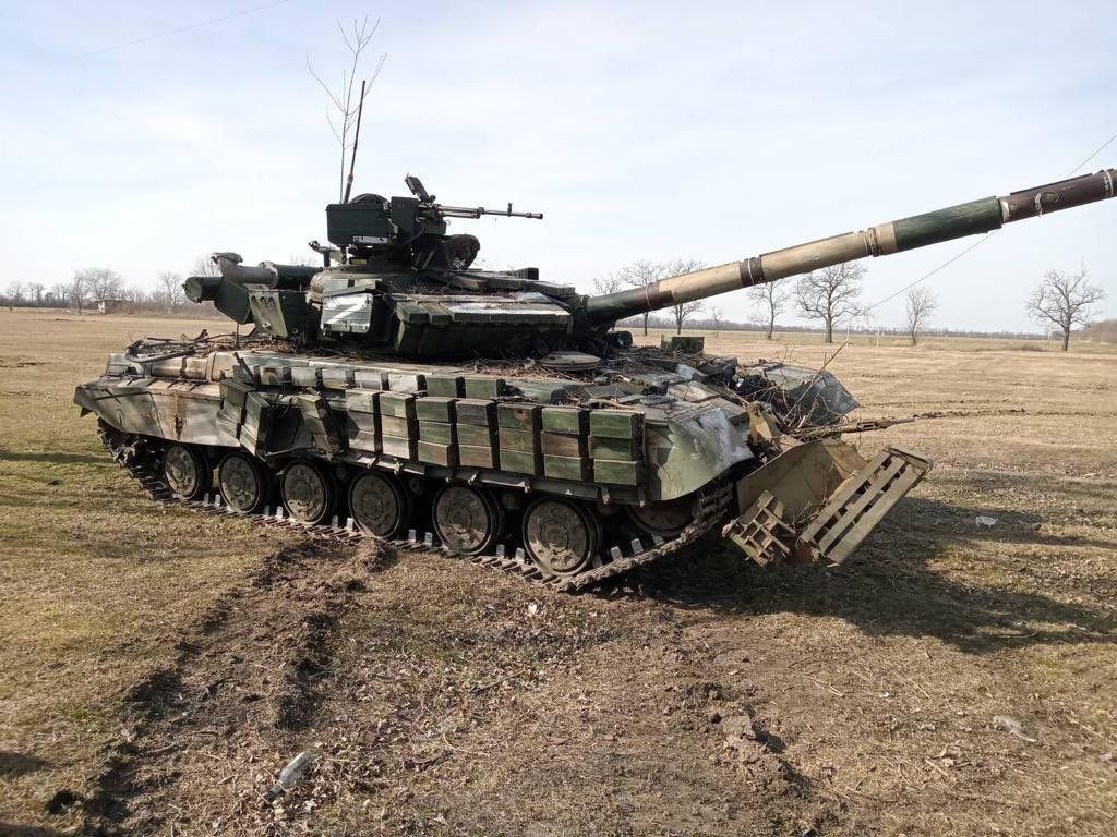 Ukrajinský tank T-64BV model 2017 zapálený kdesi ve směru na Charkov. Není patrné co požár způsobil, ale hoří i všude kolem něj (a to i dost daleko). Vnější palivové nádrže jsou ale neporušené, stejně tak jako samotné pancéřování. Video v odkazu.