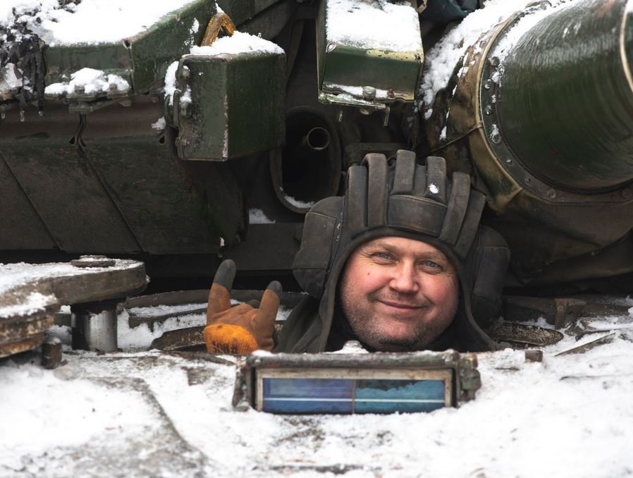 Vánočně vyzdobený ukrajinský T-64BV model 2022 od 28. samostatné mechanizované brigády, kdesi poblíž Bachmutu.