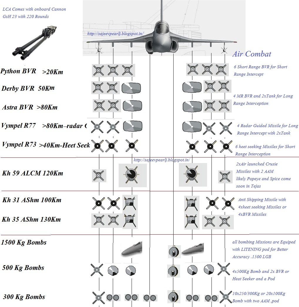 Výzbrojní schémata pro Tejas. Jedno je z roku 2015 a druhé z roku 2022. Rozdíl ve schématech je velký a krom PLŘS R-73 se na Tejas (2022) nedostala žádná ruská výzbroj